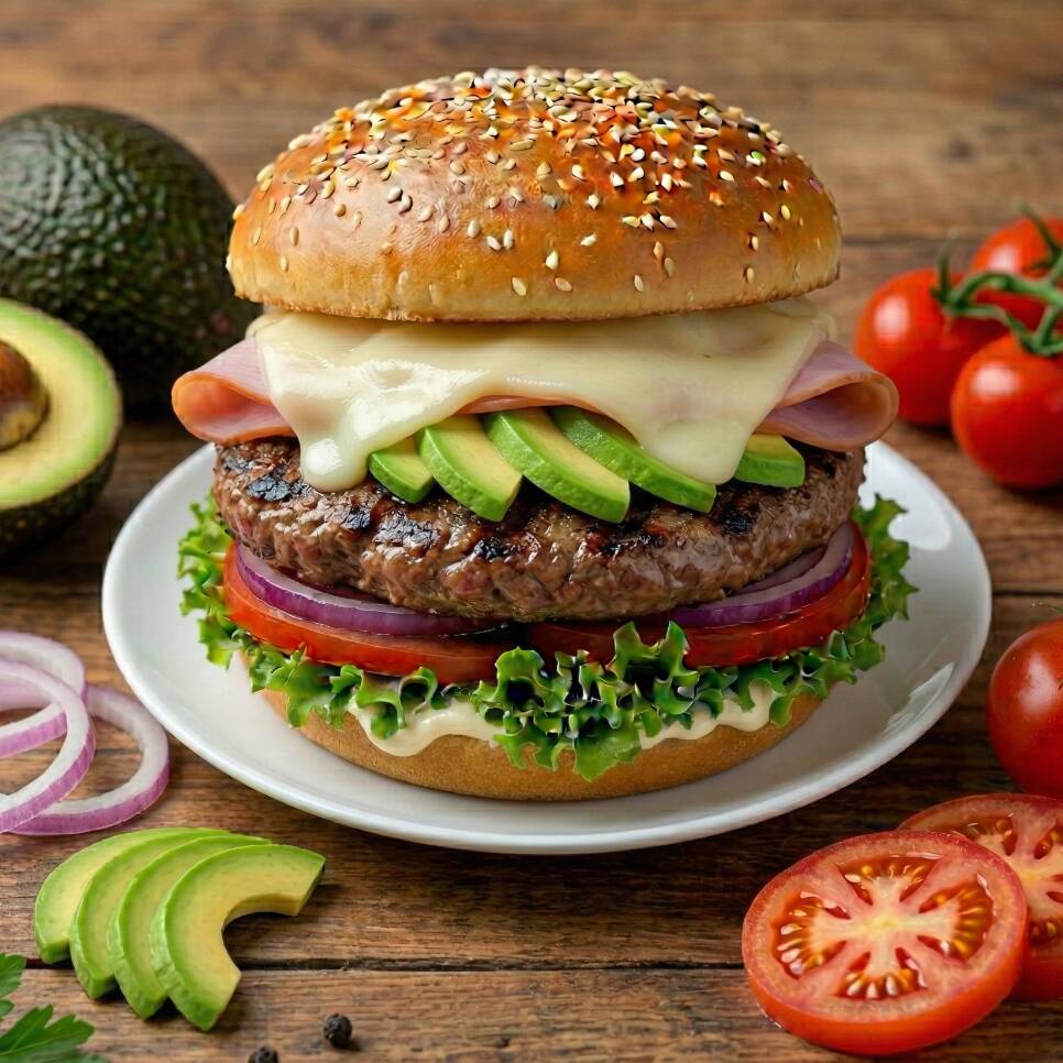 Sirlon, Jamon, Aguacate, Lechuga. Tomate, Cebolla Morada, Queso Blanco