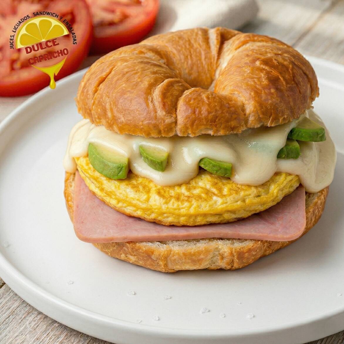"¡El desayuno perfecto en un solo bocado! Disfruta de una suave y esponjosa omelette preparada al momento, acompañada de finas rebanadas de jamón de pavo y queso manchego fundido. Todo dentro de nuestro croissant hojaldrado con el toque cremoso y fresco del aguacate. ¡Elegante, nutritivo y delicioso!"