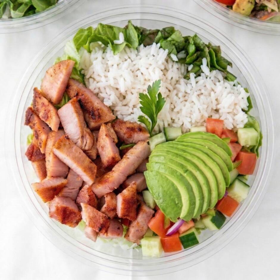 "Exquisito lomo de cerdo a la plancha, sellado hasta quedar jugoso y dorado a la perfección. Servido sobre una base de arroz blanco al vapor y lechuga crujiente, acompañado de aguacate cremoso, tomate, pepino, pimiento verde, cebolla morada y espinaca fresca."