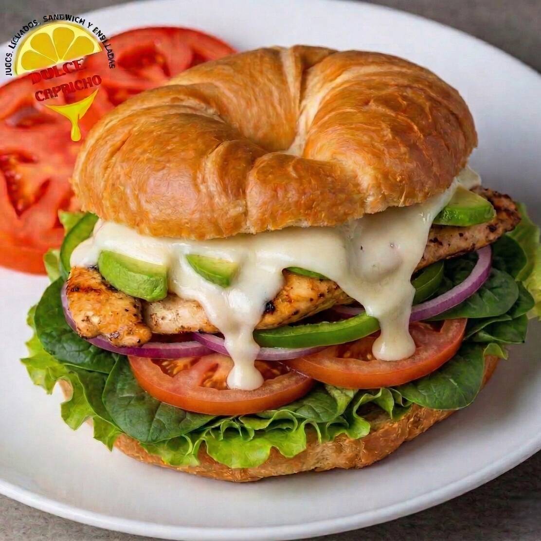Un imponente croissant hojaldrado relleno de jugosa pechuga de pollo a la plancha y queso manchego fundido. Se acompaña con una nutritiva mezcla de lechuga romana y espinaca fresca, pimiento verde, tomate, cebolla morada y el toque cremoso de nuestro mejor aguacate. ¡Completo, ligero y lleno de sabor!" Servido con una porción de crujientes papas deshidratadas 🍟