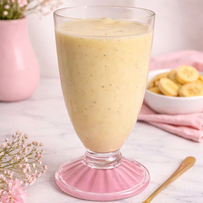 Licuado de plátano Delicioso licuado preparado con leche entera, servido en vaso de medio litro, elaborado con plátano natural, que aporta un sabor dulce y una textura cremosa y reconfortante. Ideal para iniciar el día o como snack nutritivo.
