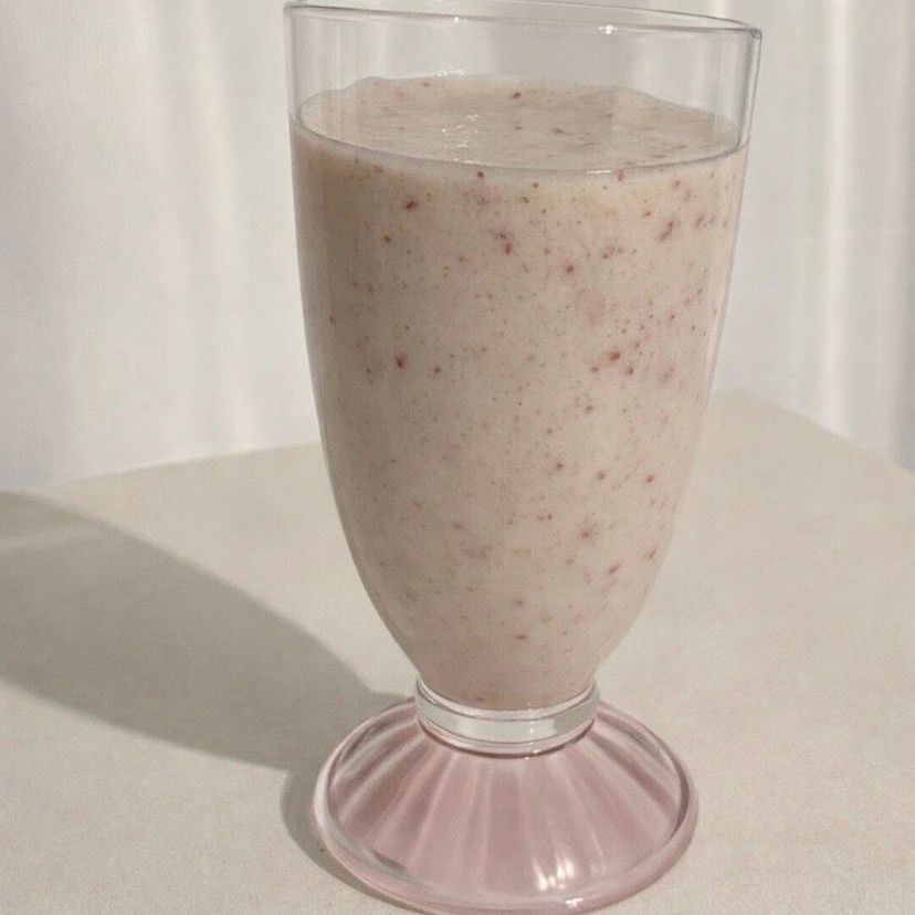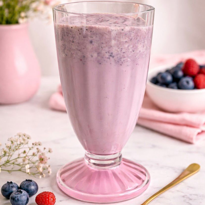 Licuado de frutos rojos Delicioso licuado preparado con leche entera, servido en vaso de medio litro, elaborado con una mezcla de frambuesas, fresas, mora azul y zarzamora, que aporta un sabor equilibrado entre dulce y ligeramente ácido, además de una textura cremosa y refrescante. Ideal para disfrutar en cualquier momento del día.
