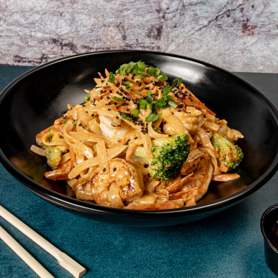 Pasta japones mezclada con una deliciosa combinacion de pollo, camaron, verduras, bañada en nuestra salsa de la casa.