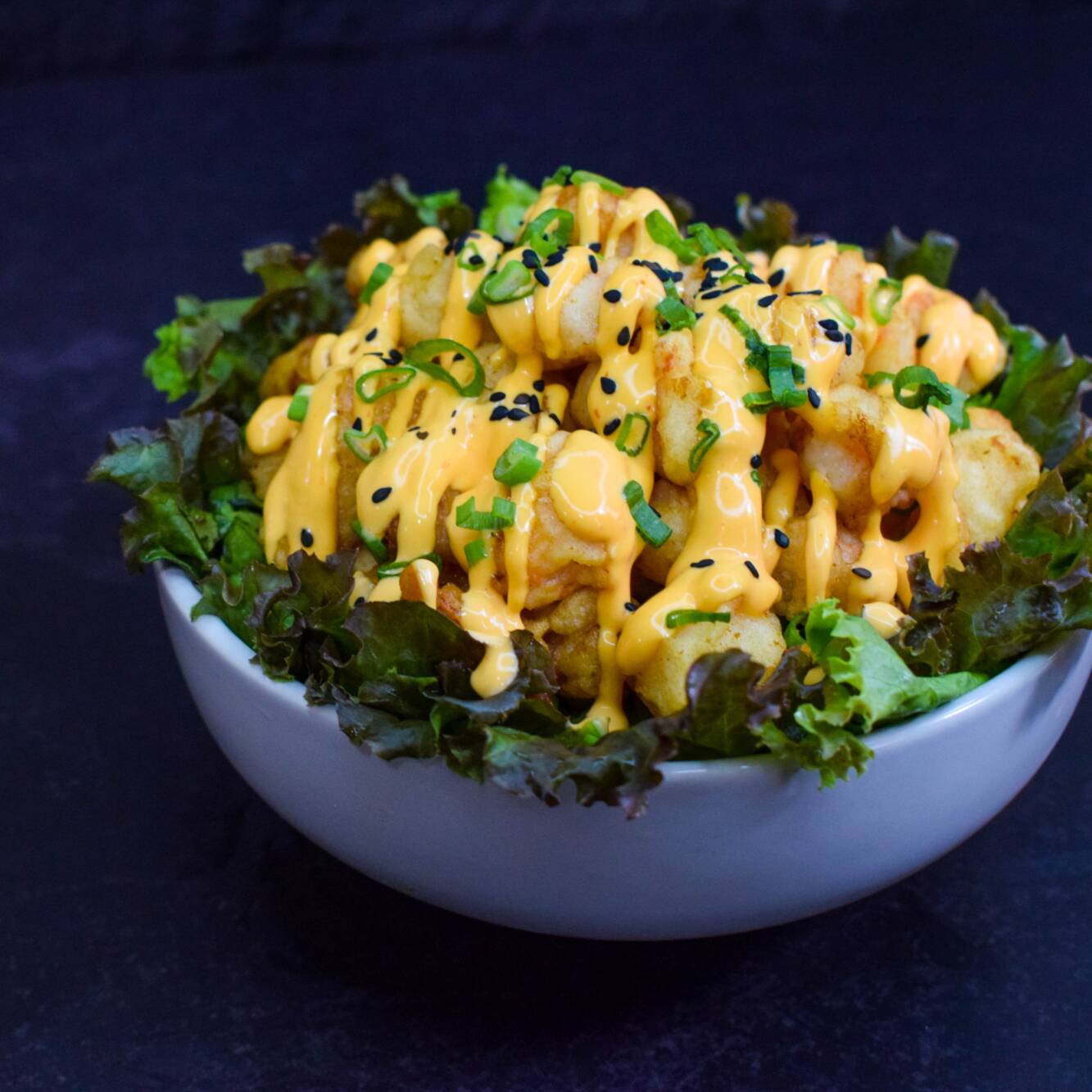 Camarones roca bañados en salsa de la casa con cebollin sobre cama de lechuga.