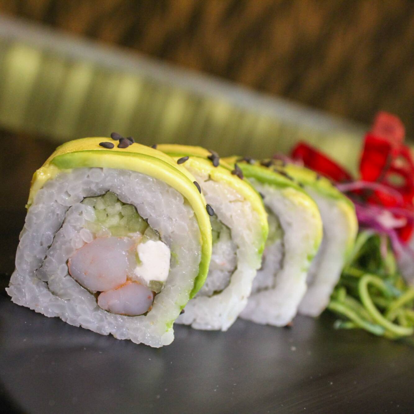 Por dentro: camaron, queso crema y pepino. por fuera: aguacate.