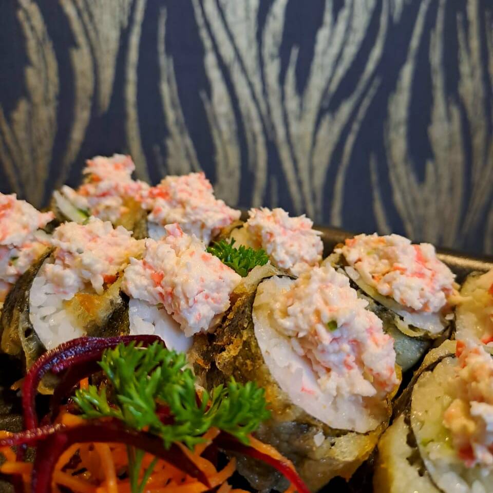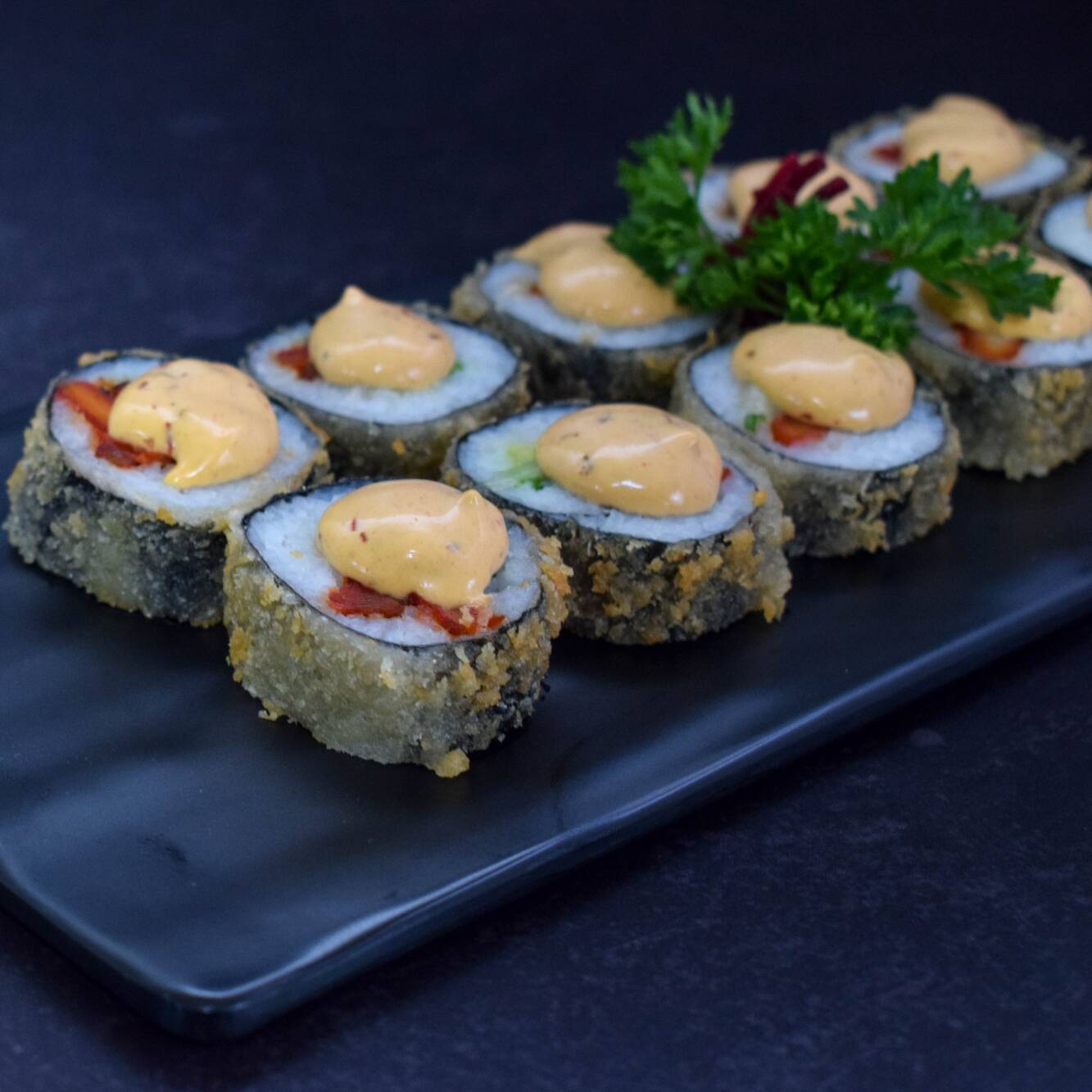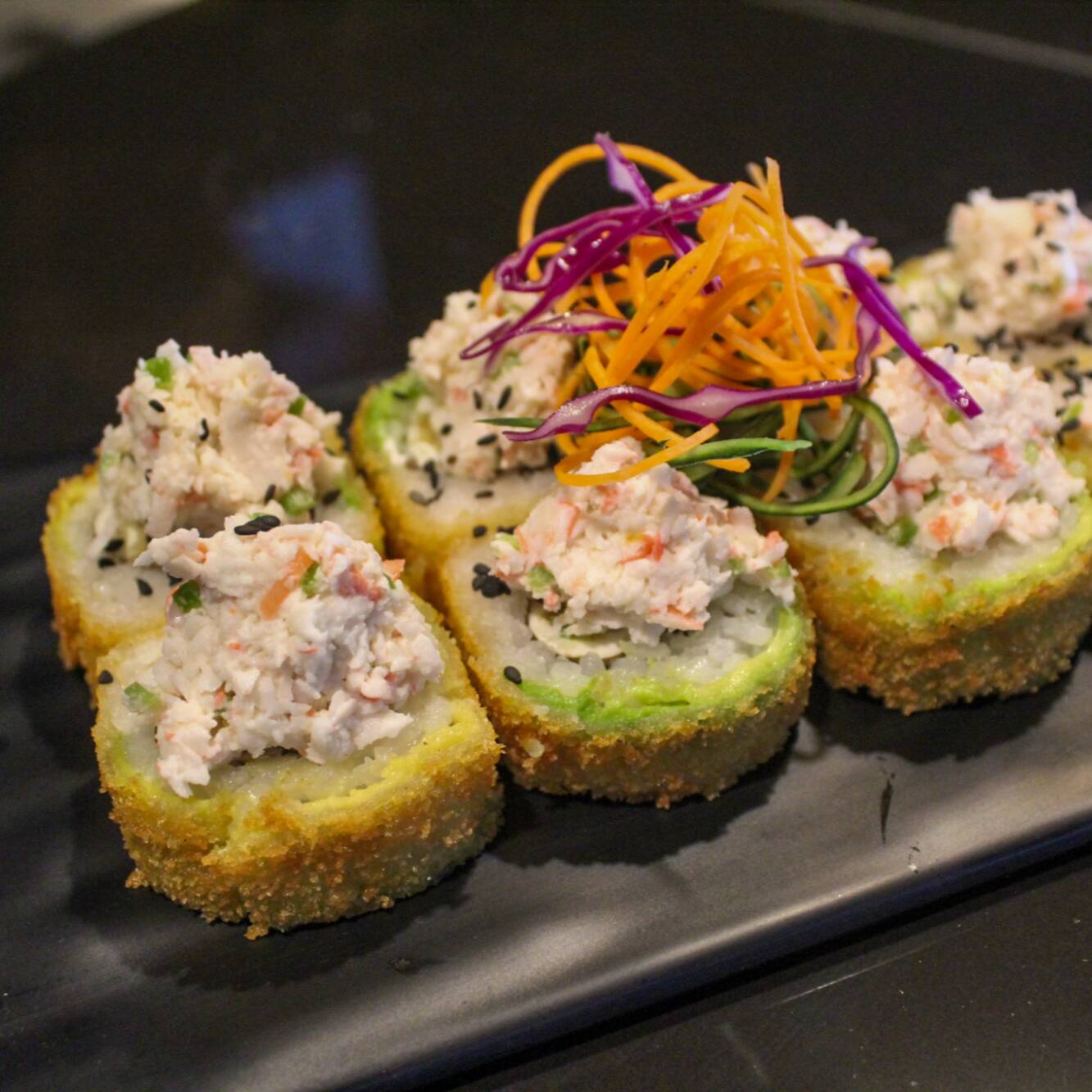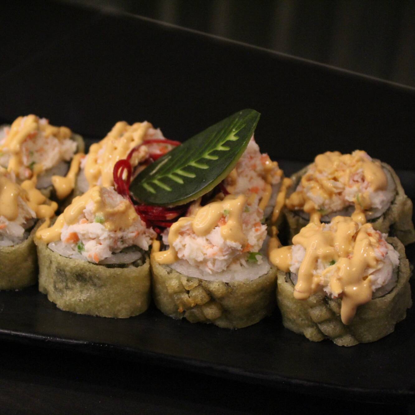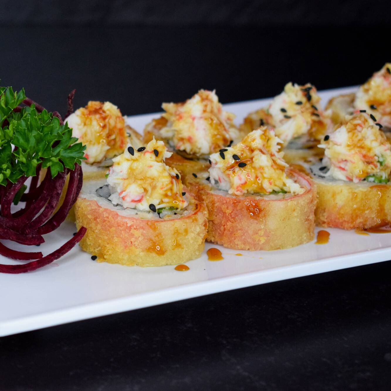 Por dentro: cangrejo, aguacate y queso crema. por fuera: empanizado con cangrejo, tampico y salsa de anguila.