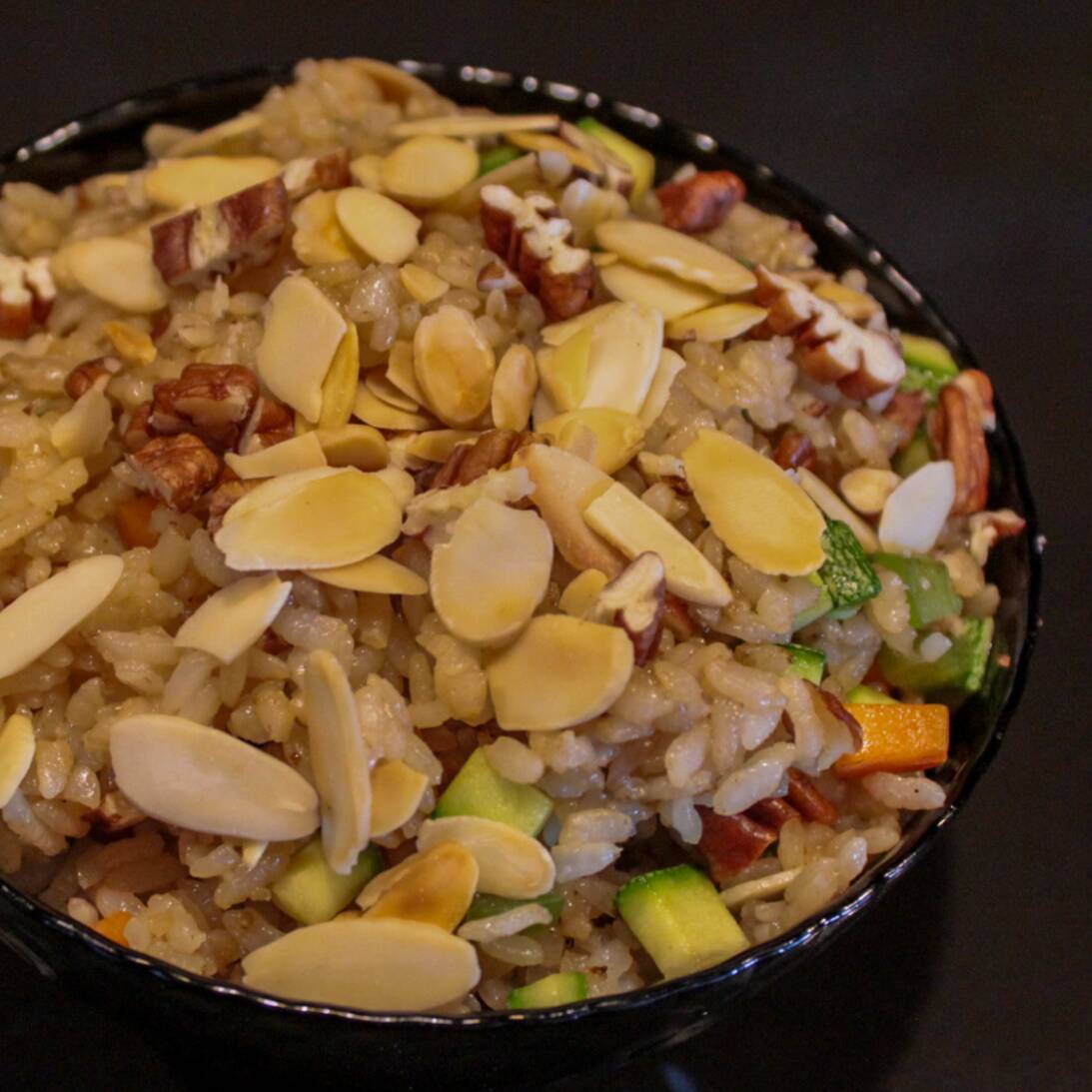 Arroz frito con verduras, salmon, pulpo y camaron sazonado con ajo y especias.