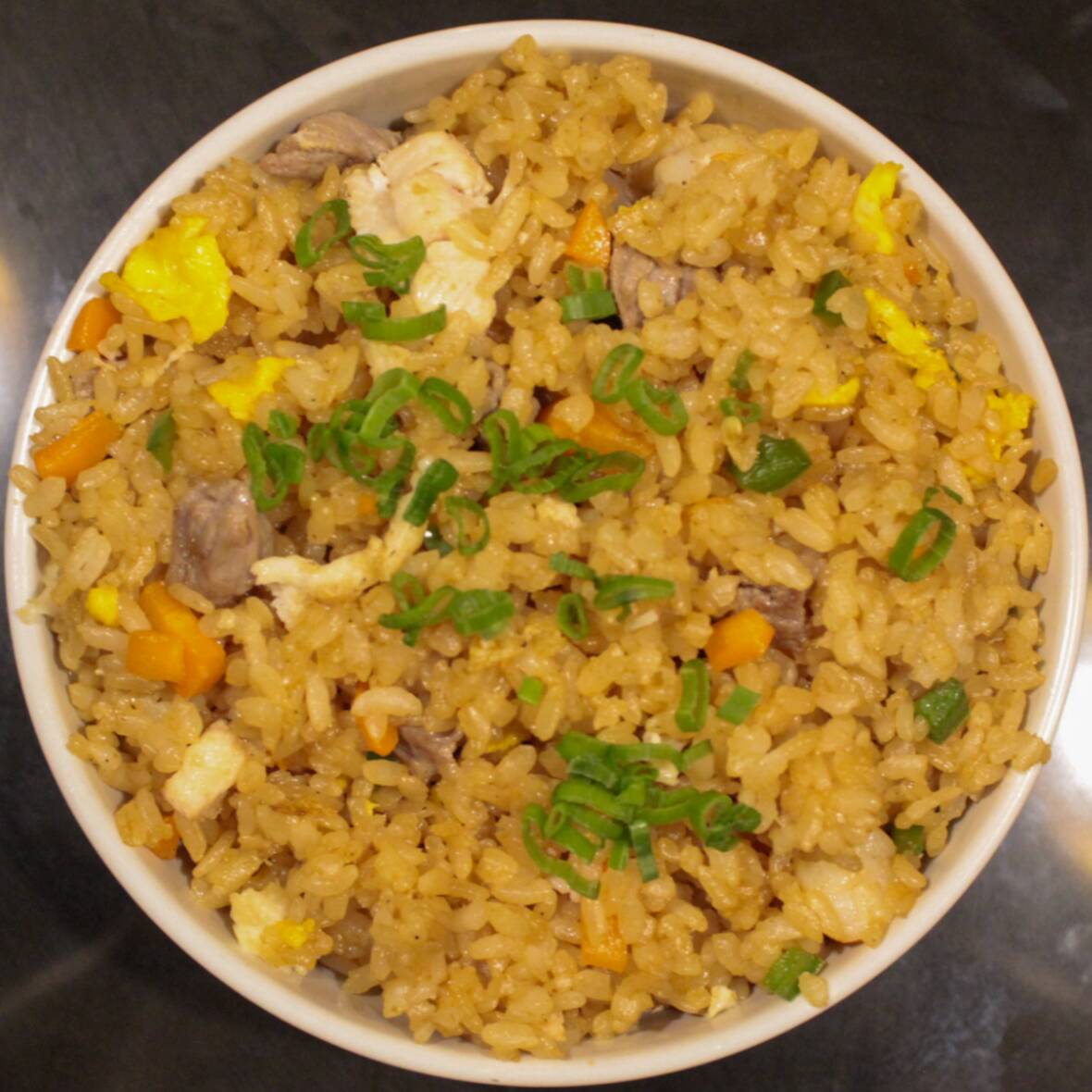Arroz frito con zanahoria, pimiento morron, cebolla, huevo, carne, pollo y camaron.