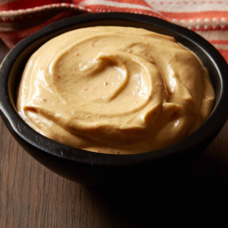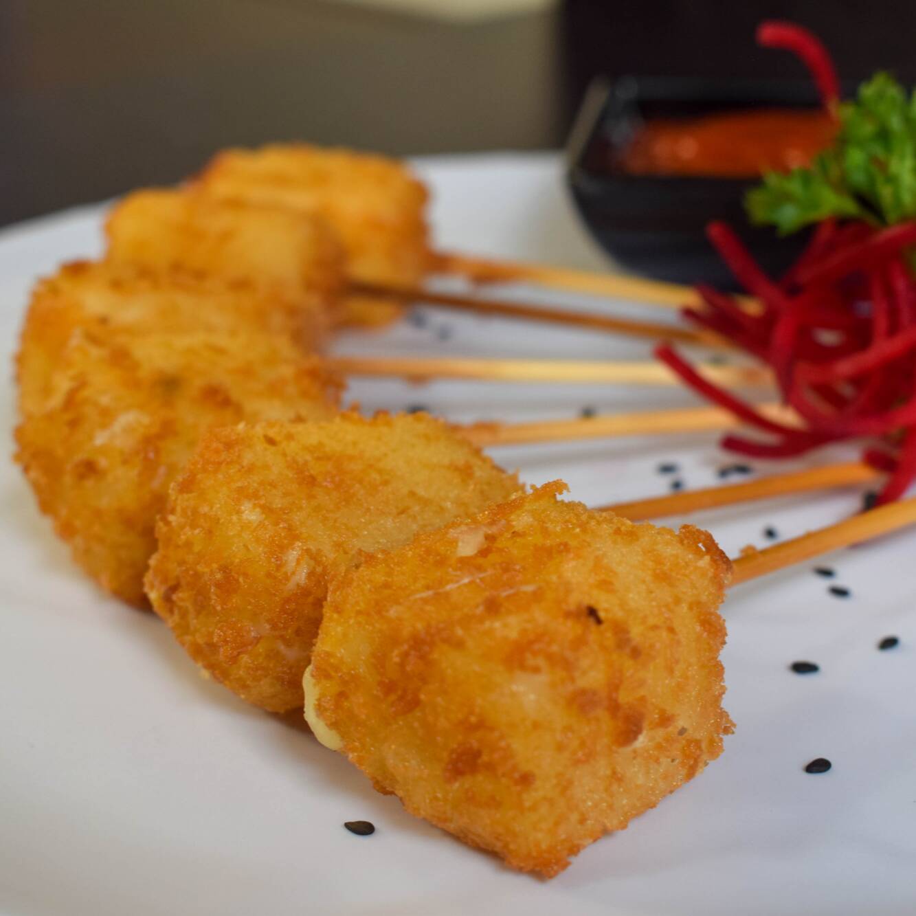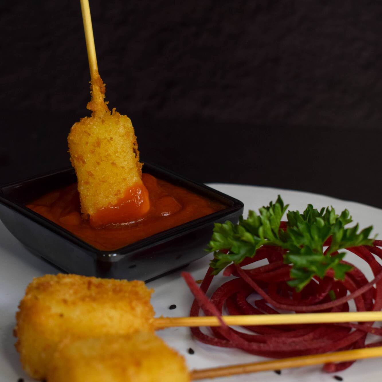 Por dentro: carne de trompo, queso manchego, aguacate y cebollin. por fuera: empanizado y acompañado con aderezo chipotle.