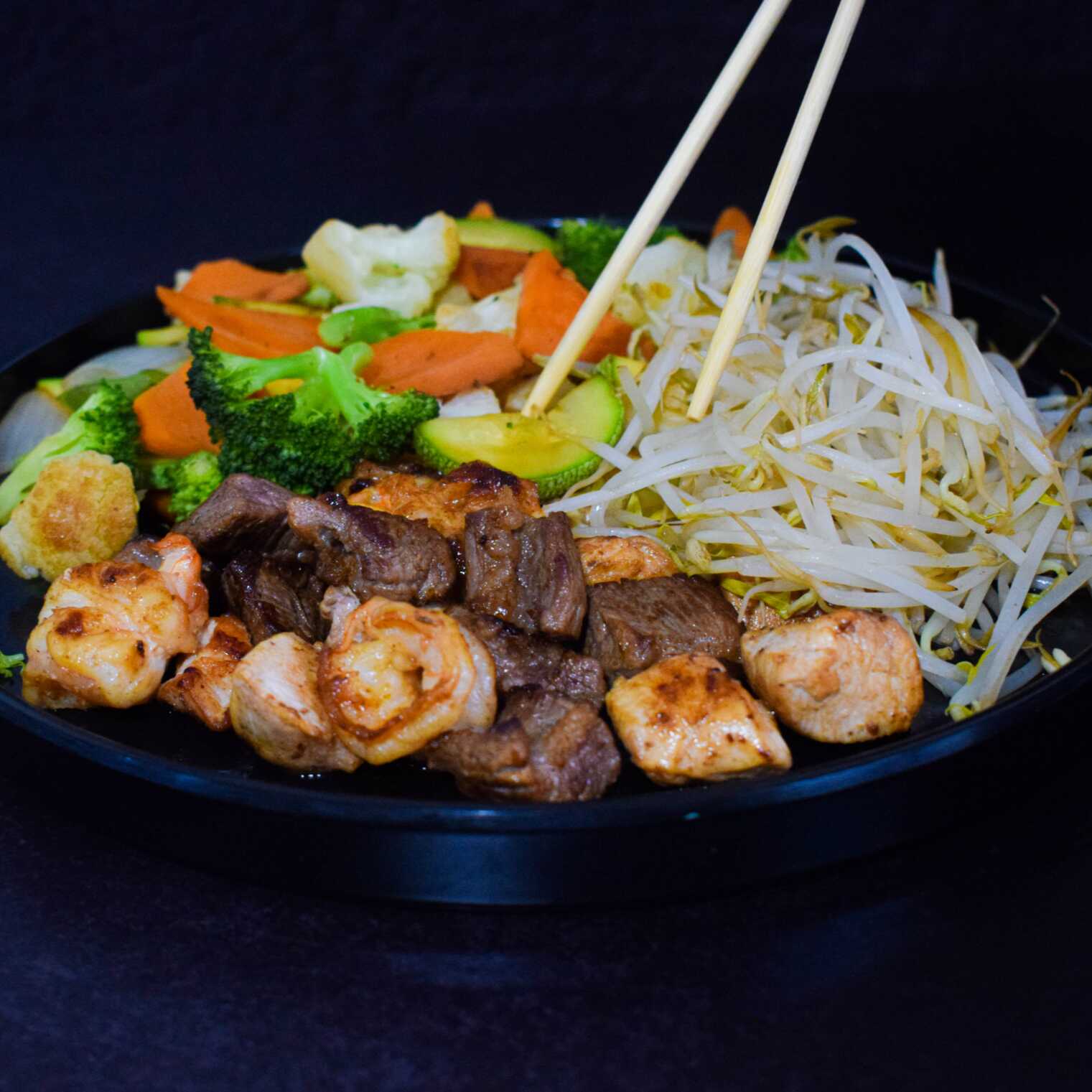 Ricas verduras a la plancha acompañadas de germinado de soya, pollo, carne y camaron.