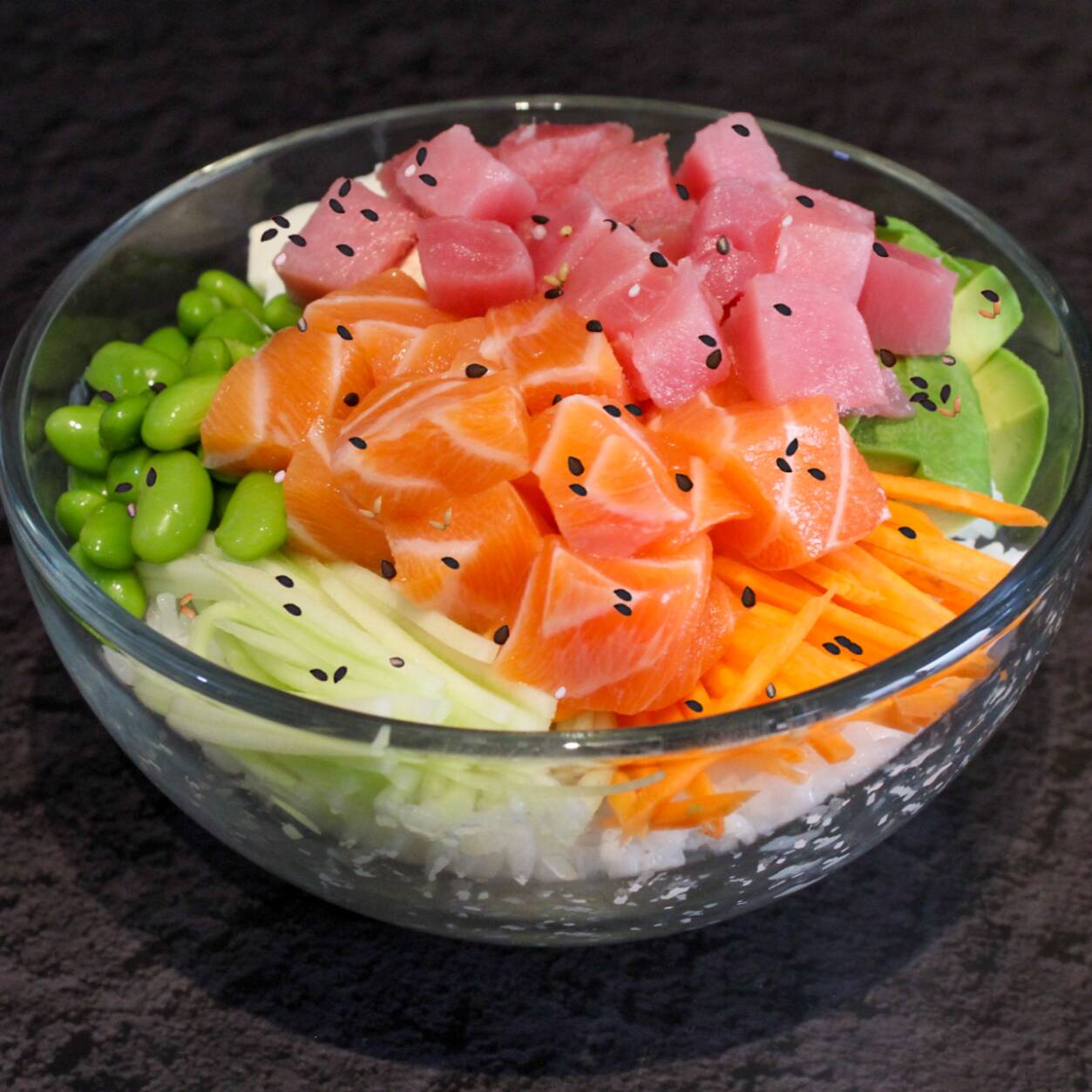 Arma tu Poke Bowl eligiendo 1 base con 2 proteinas, agrega 2 aderezos y 5 toppings a elegir, para una persona