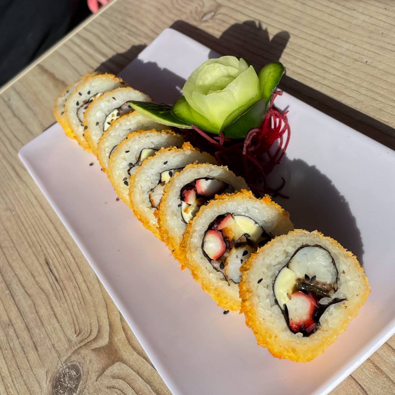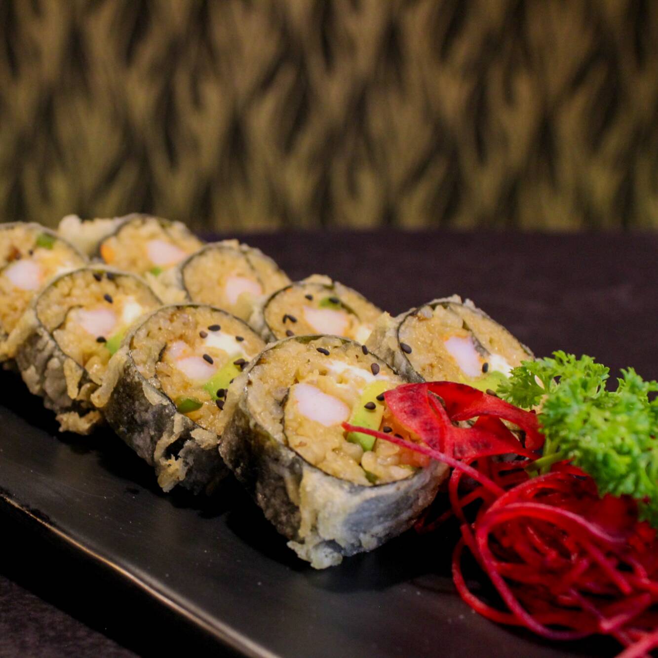 Por dentro: Camaron, queso crema y aguacate. Por fuera: empanizado bañado en salsa de anguila.