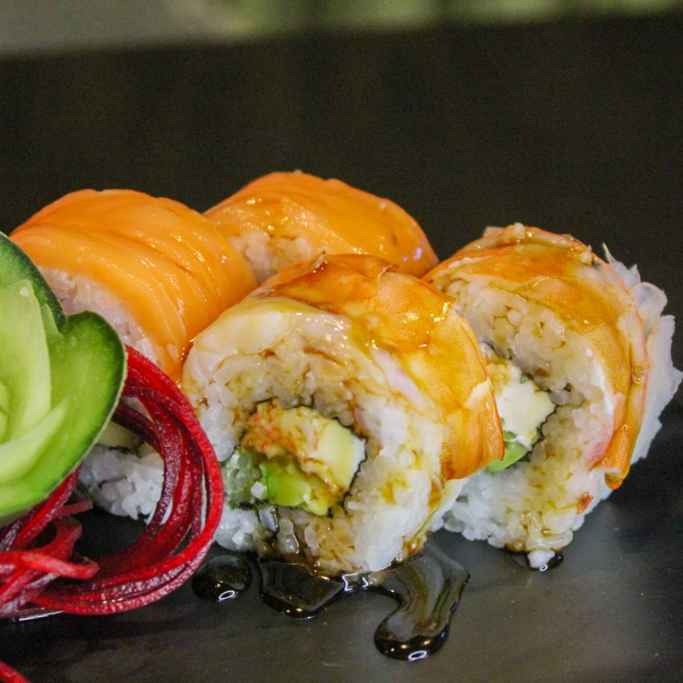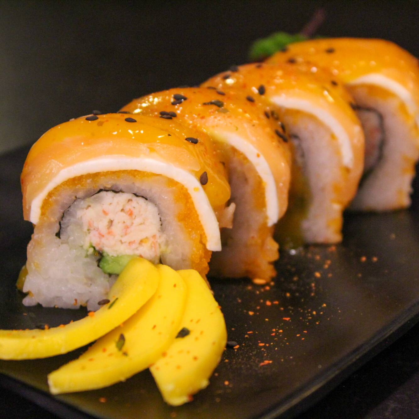 Por dentro: tampico y aguacate. por fuera: queso crema y salmon, bañado de aderezo chipotle con mango.