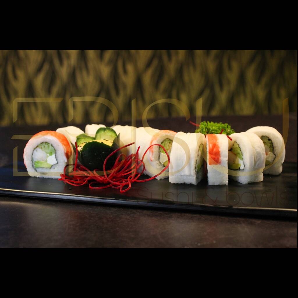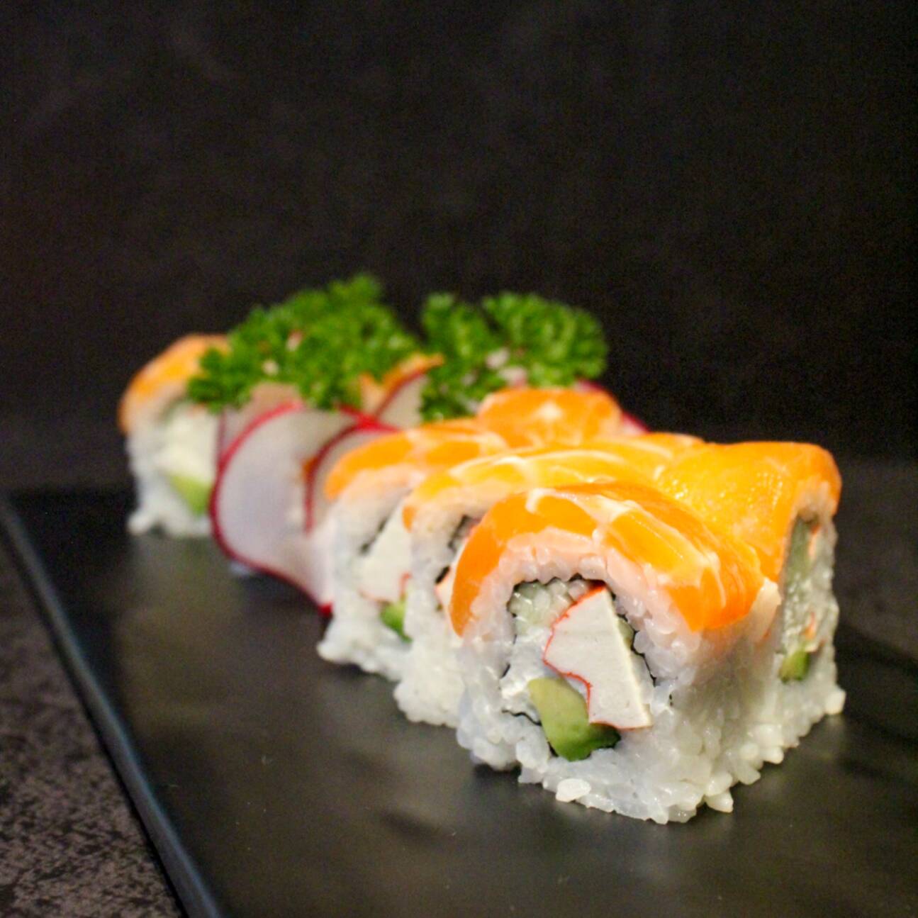 Por dentro: cangrejo, aguacate, pepino y queso crema por fuera: salmon.