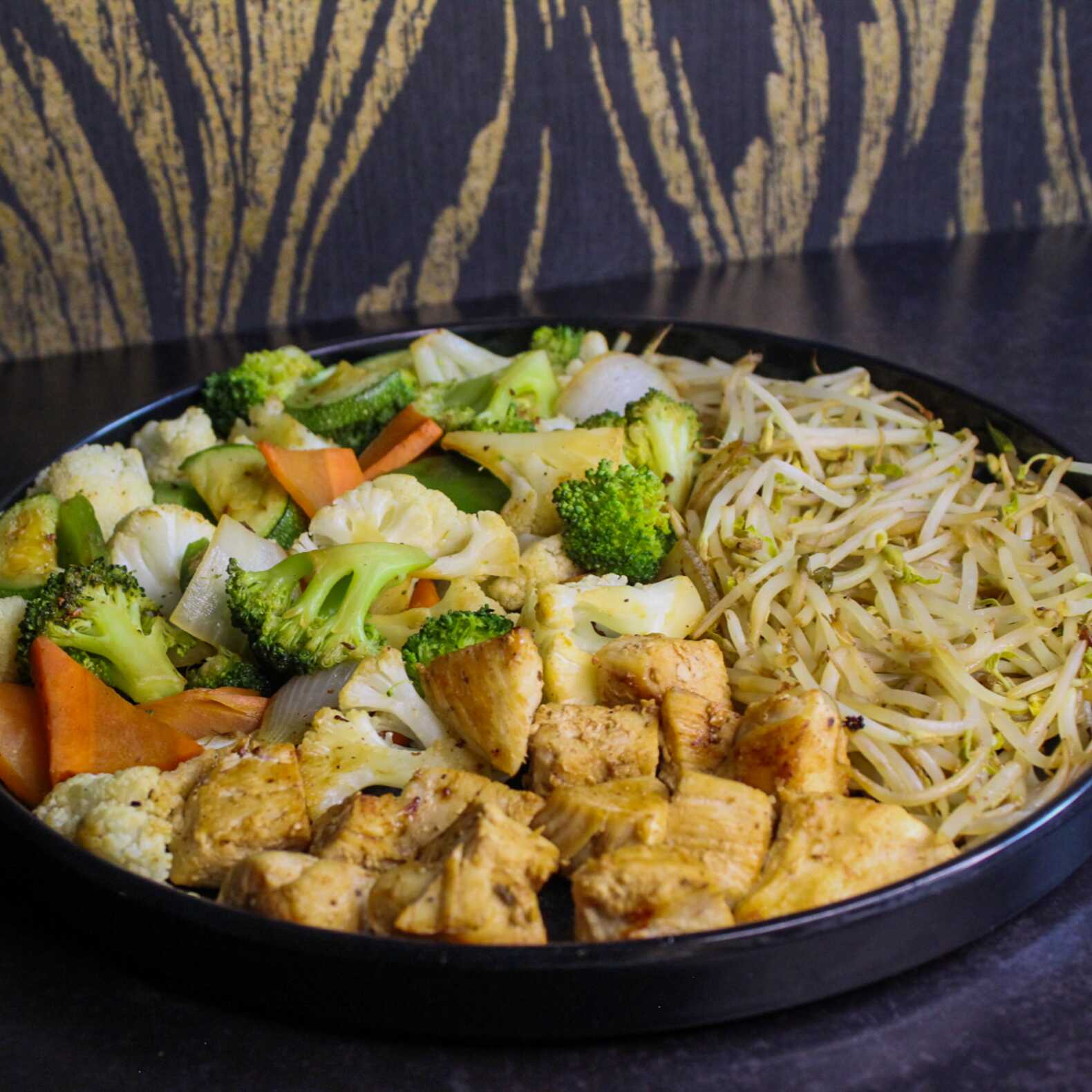 Ricas verduras a la plancha acompañadas de germinado de soya y pollo.