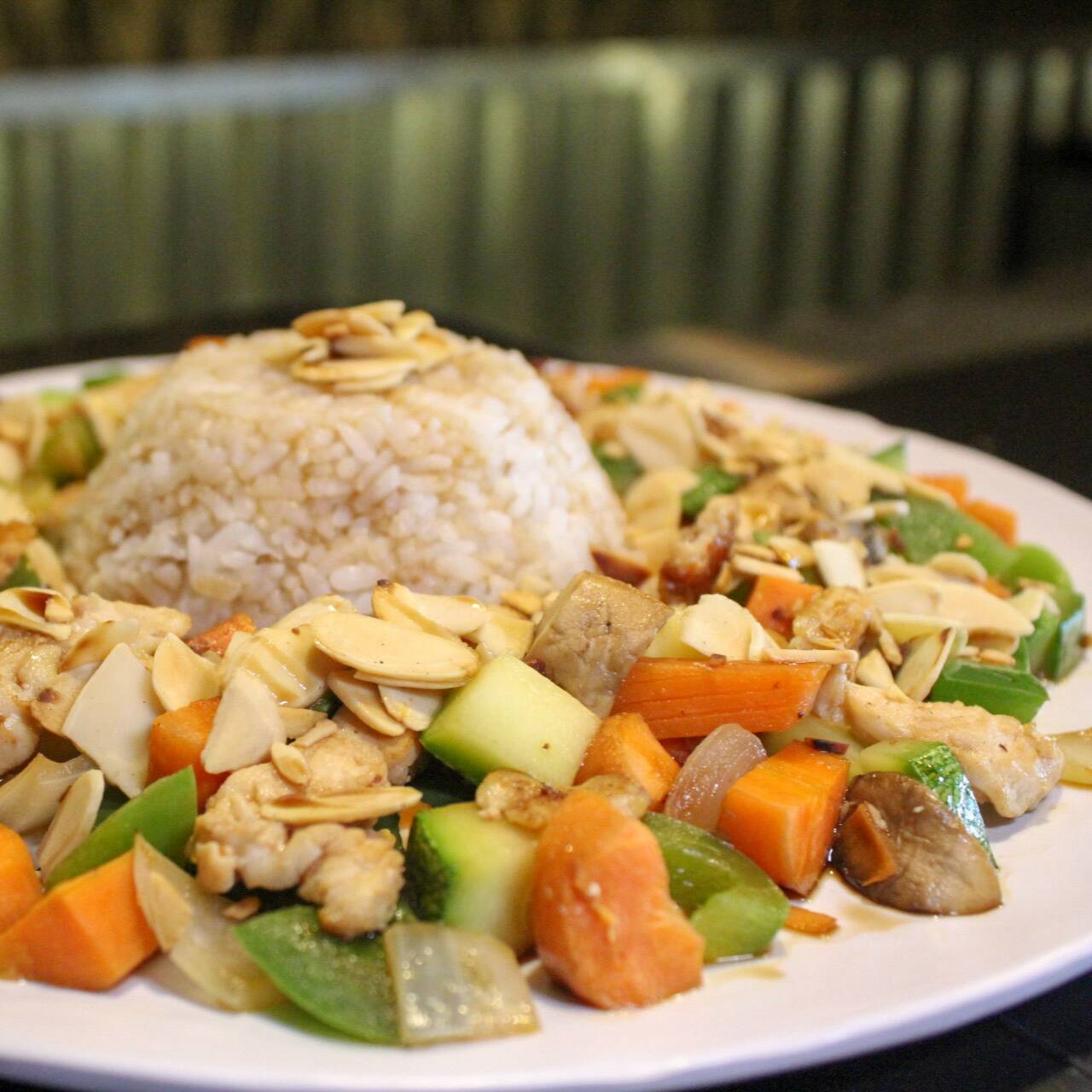 Pollo fileteado y mix de verduras bañado en salsa de anguila acomprañado de arroz blanco o frito.