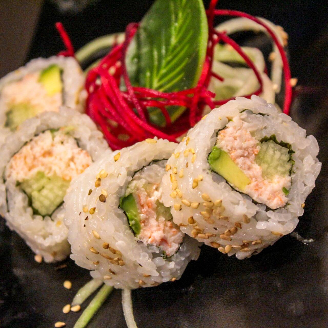 Por dentro: pasta de cangrejo, pepino y aguacate. por fuera: ajonjoli.