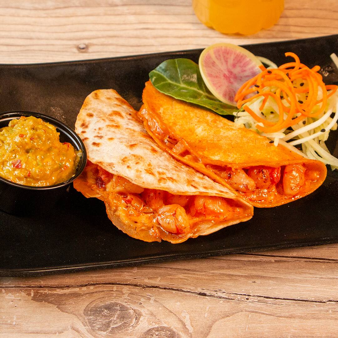 2 Tacos de camaron gratinado con queso manchego, bañado en salsa de la casa acompañado de guacamole y montado sobre tortilla de maiz o harina. (1)