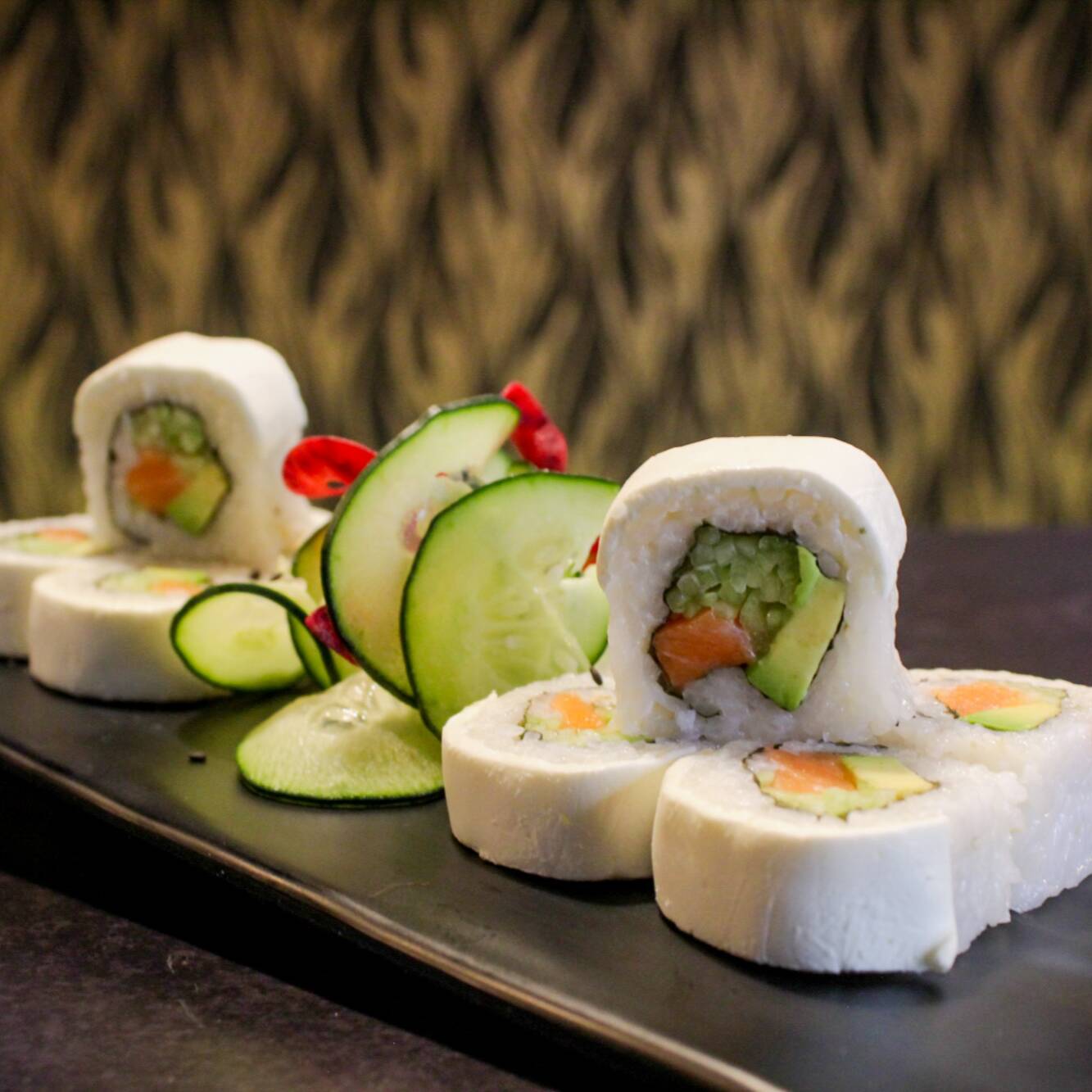 Por dentro: salmon, pepino y aguacate. por fuera: queso crema.