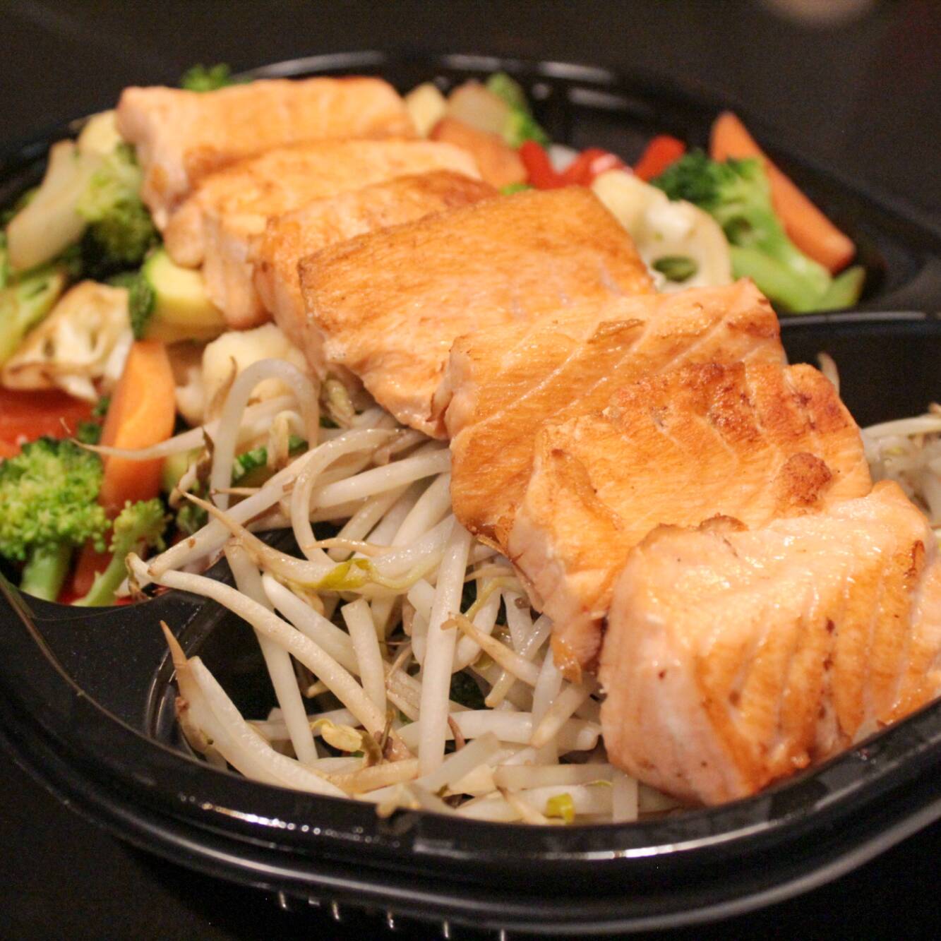 Ricas verduras a la plancha acompañadas de germinado de soya y salmon.