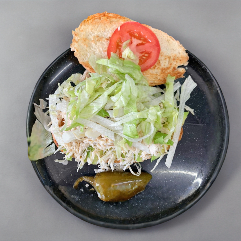 Pan francés, pollo desmenuzado, lechuga, tomate, chile jalapeño.