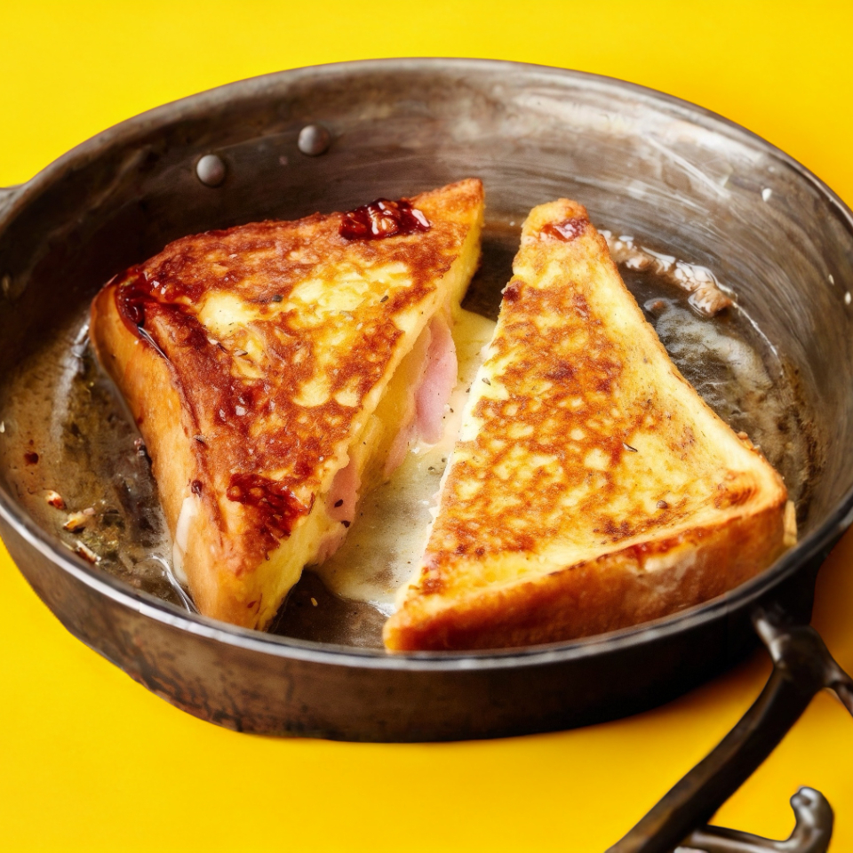 French toast, jamón y queso gratinado