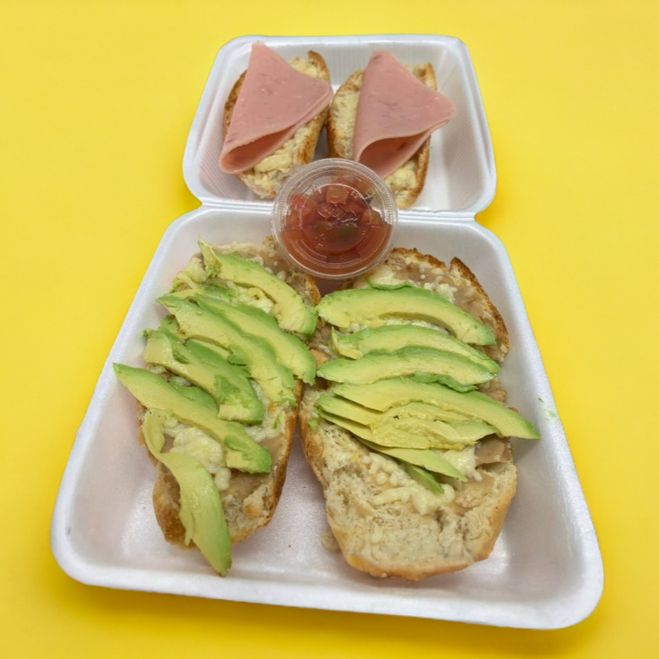 Bolillo recién hecho, tostado, frijoles, queso manchego gratinado.