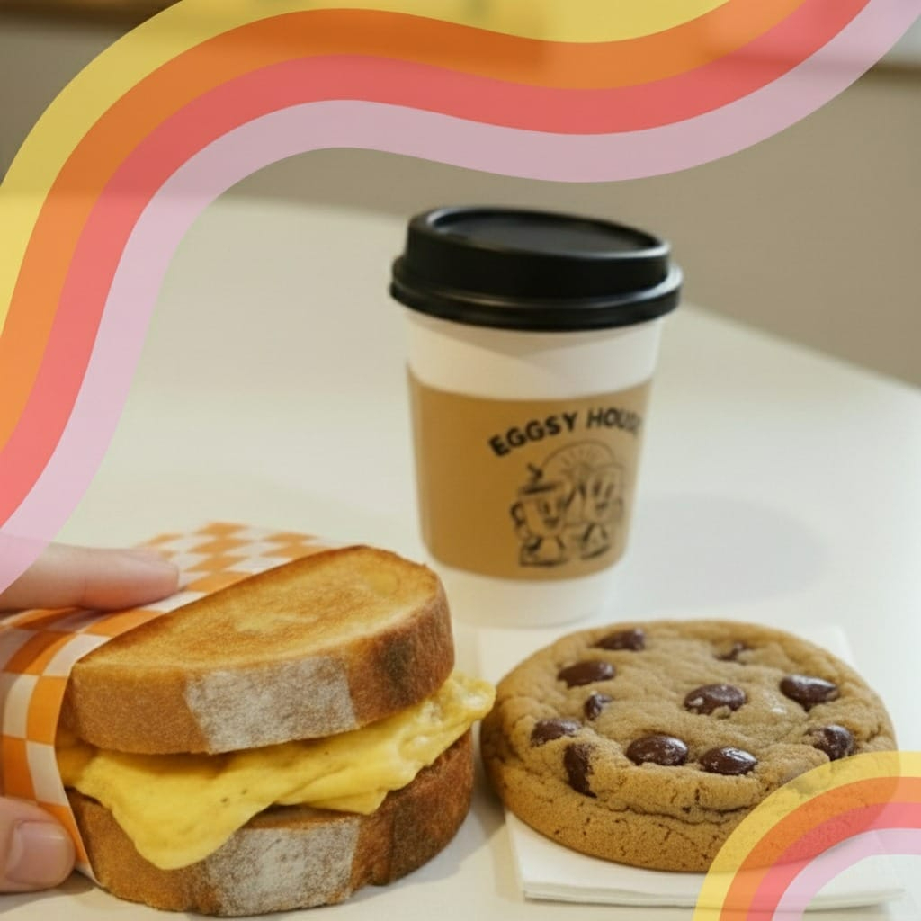 Sándwich con pan de hogaza blanca relleno de huevo estilo coreano, en salsa chipotle y queso manchego.