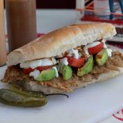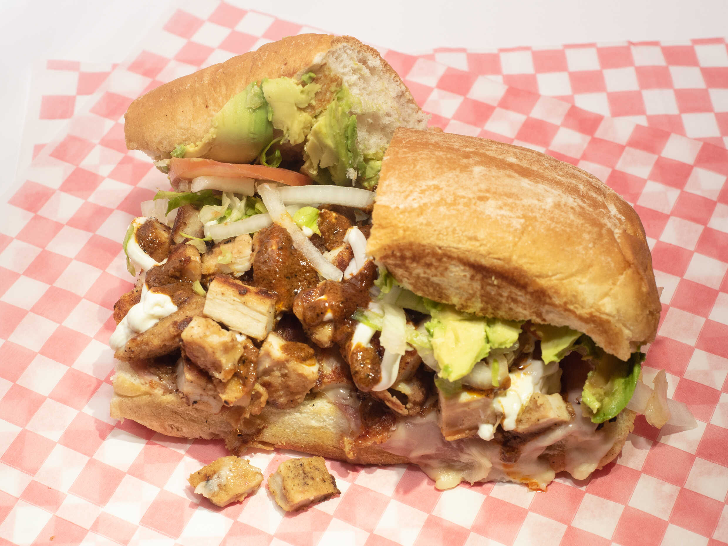 Pan telera, frijolitos, milanesa de pollo, queso chihuahua, jamón, lechuga, tomate, aguacate, cebolla, aderezo y salsa de la casa.