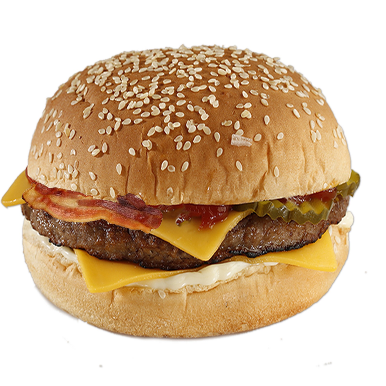 Deliciosa hamburguesa de carne top class 1/4 lb con deliciosas tiras de tocino con base de pan blanco, mayonesa, catsup, cebolla picada, queso amarillo y pepinillos