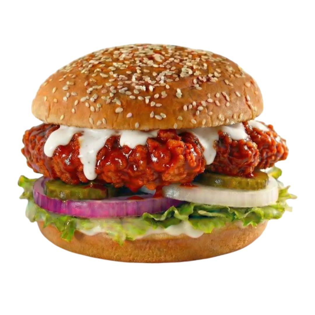 Jugosa Hamburguesa con pechuga de pollo empanizada bañada en salsa buffalo, aderezo ranch, mayonesa, lechuga, pepinillos y cebolla. Acompañada con papas francesas y un refresco de lata.