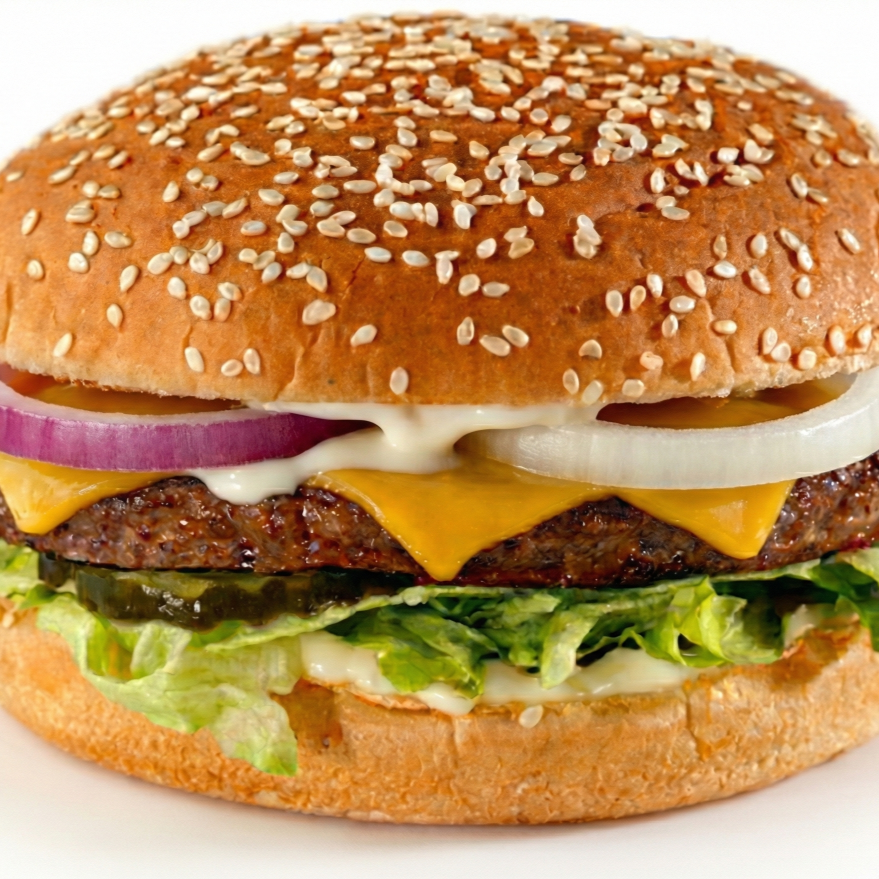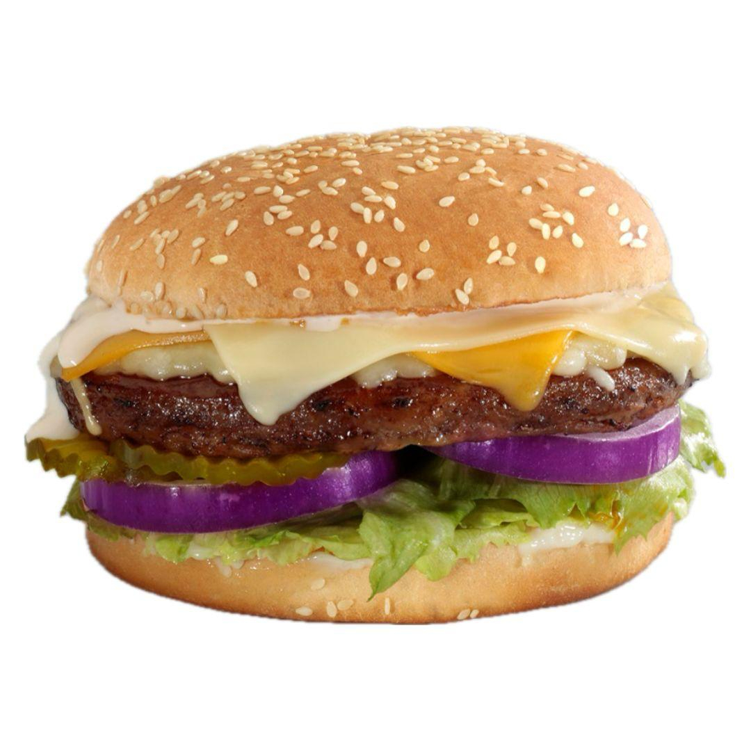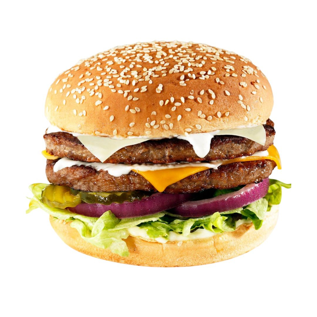 Jugosa hamburguesa con carne de res, doble queso amarillo, lechuga, pepinillos, cebolla y mayonesa. Acompañada con papas francesas y un refresco de lata.