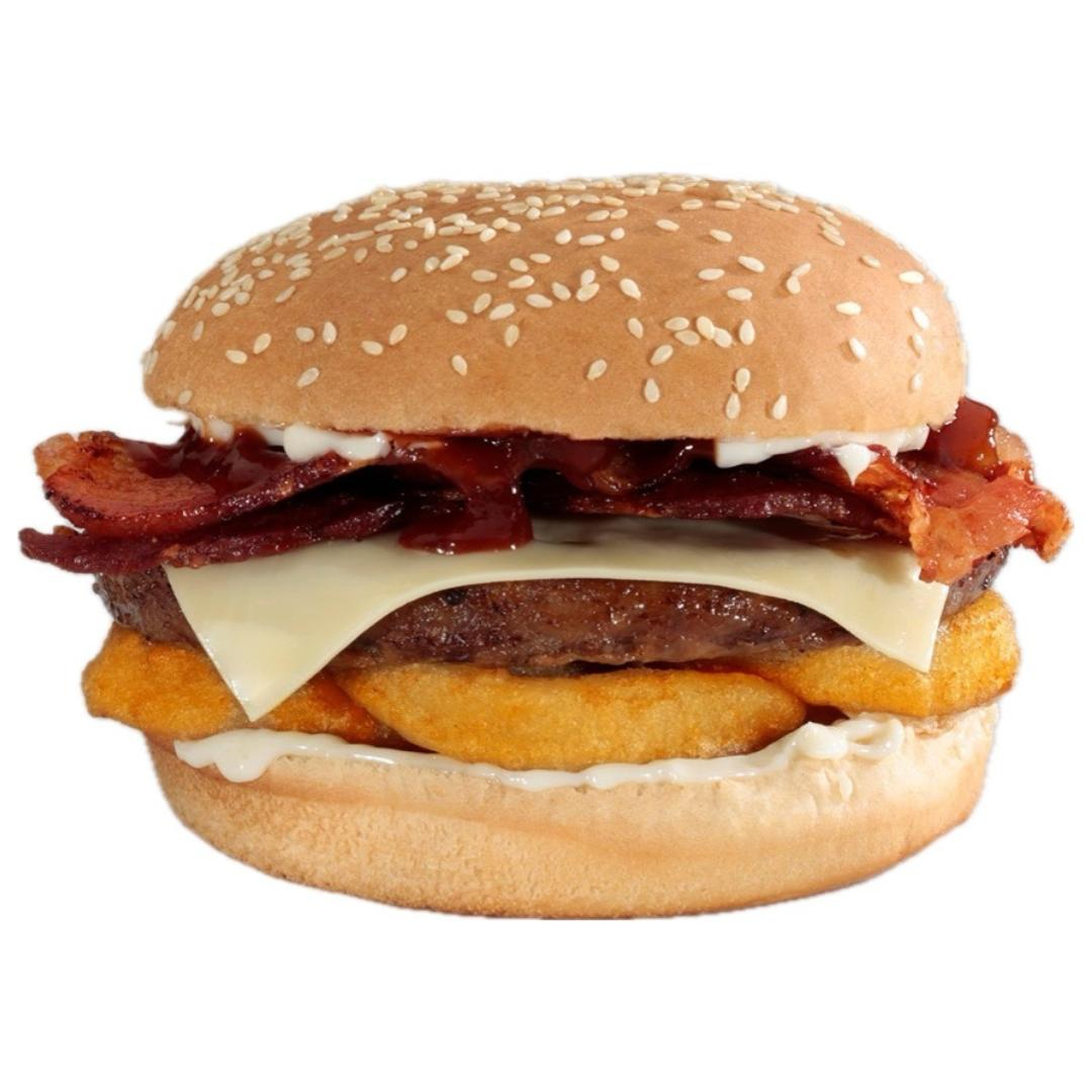 Jugosa Hamburguesa con carne de res, queso chihuahua, tocino en trozos, aros de cebolla,un toque de mayonesa y bbq. Acompañada con papas francesas y un refresco de lata.