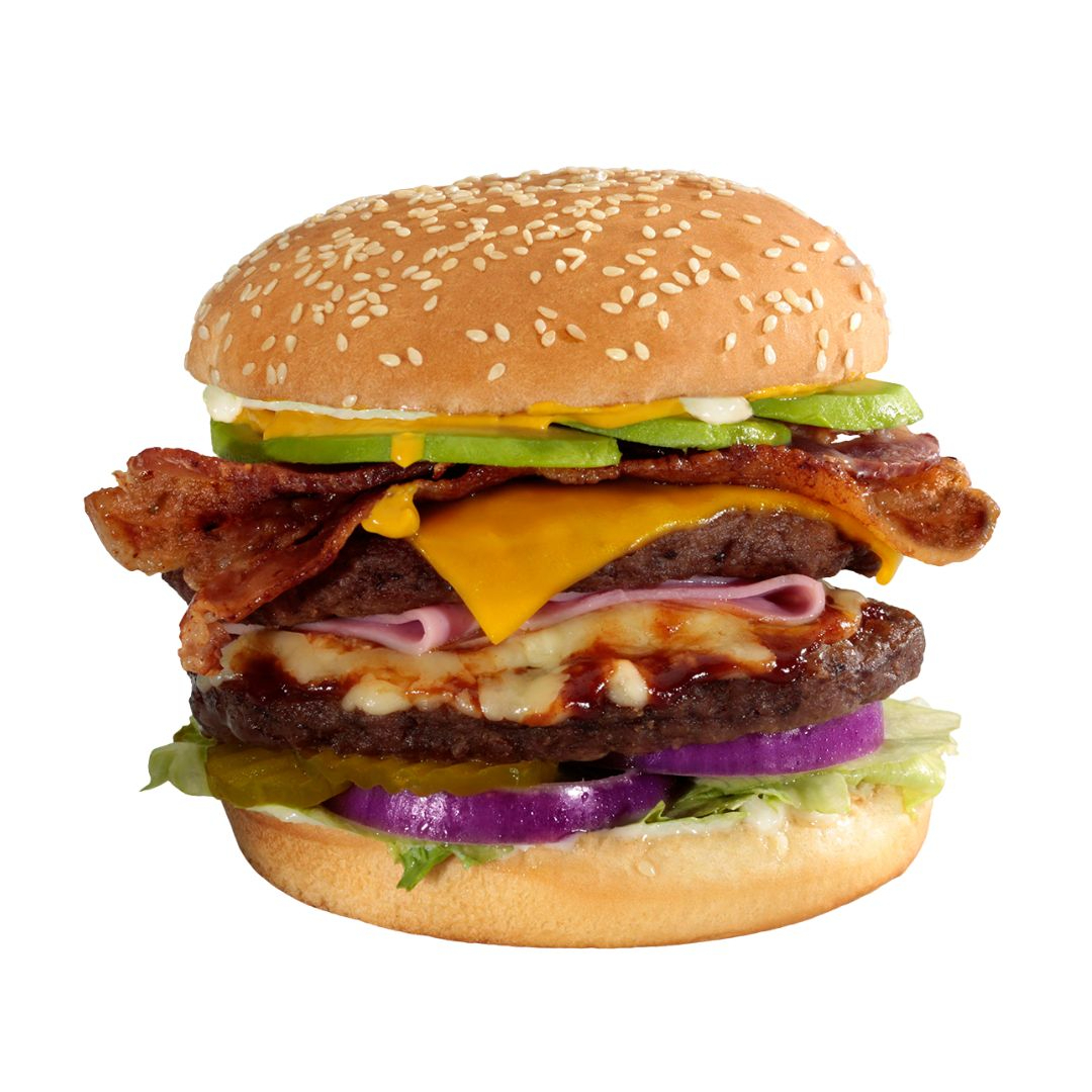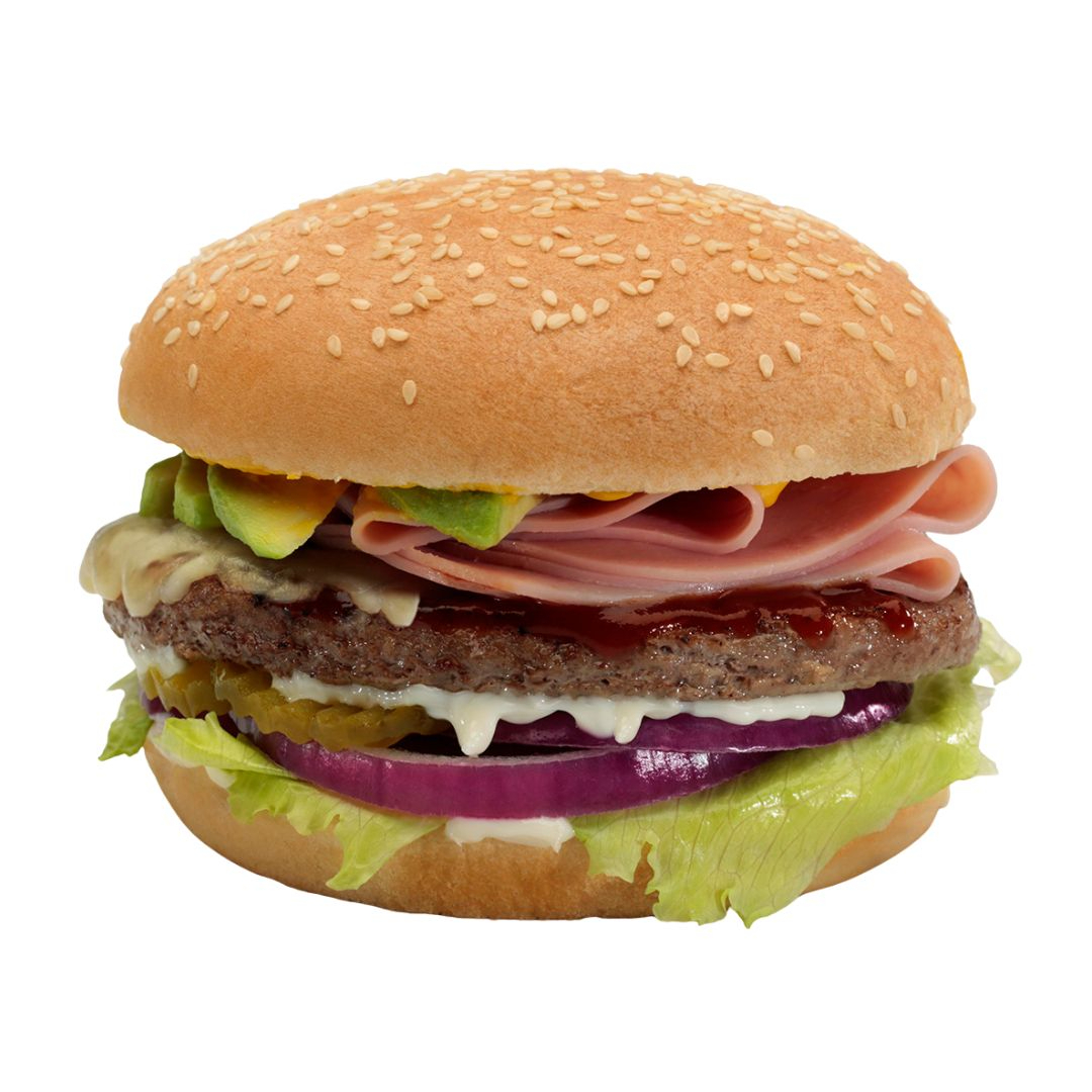 Jugosa hamburguesa con doble carne de res, queso chihuahua, queso amarillo, jamón, tocino, salsa BBQ, lechuga, cebolla, pepinillos, mayonesa y guacamole. Acompañada con papas francesas.