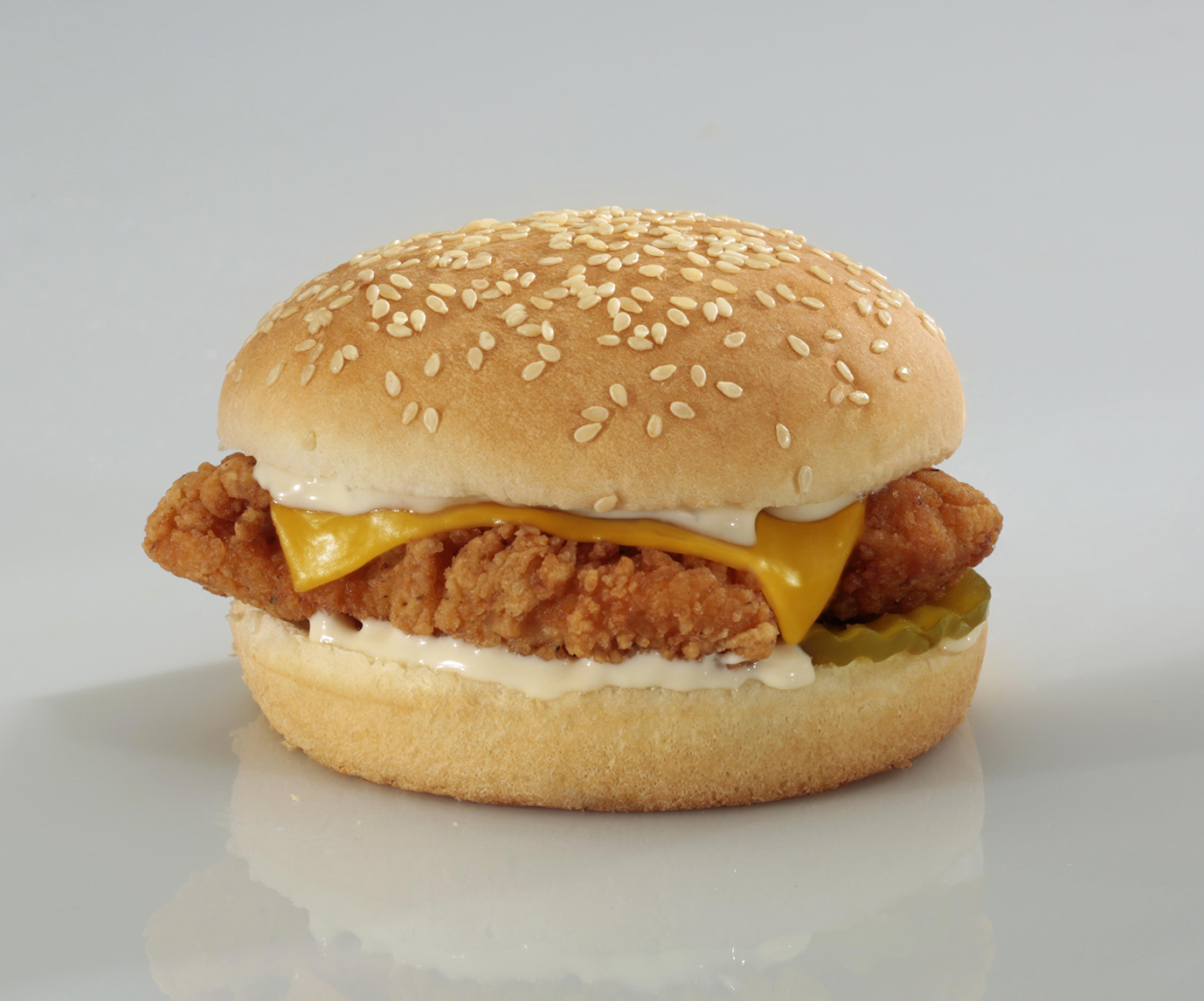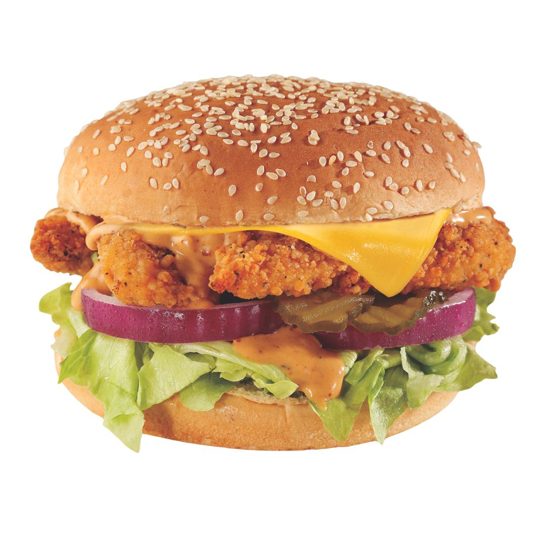 Jugosa Hamburguesa con pechuga de pollo empanizado, queso amarillo, mayonesa, lechuga, pepinillos, cebolla y aderezo chipotle cremoso. Acompañada con papas francesas y un refresco de lata.