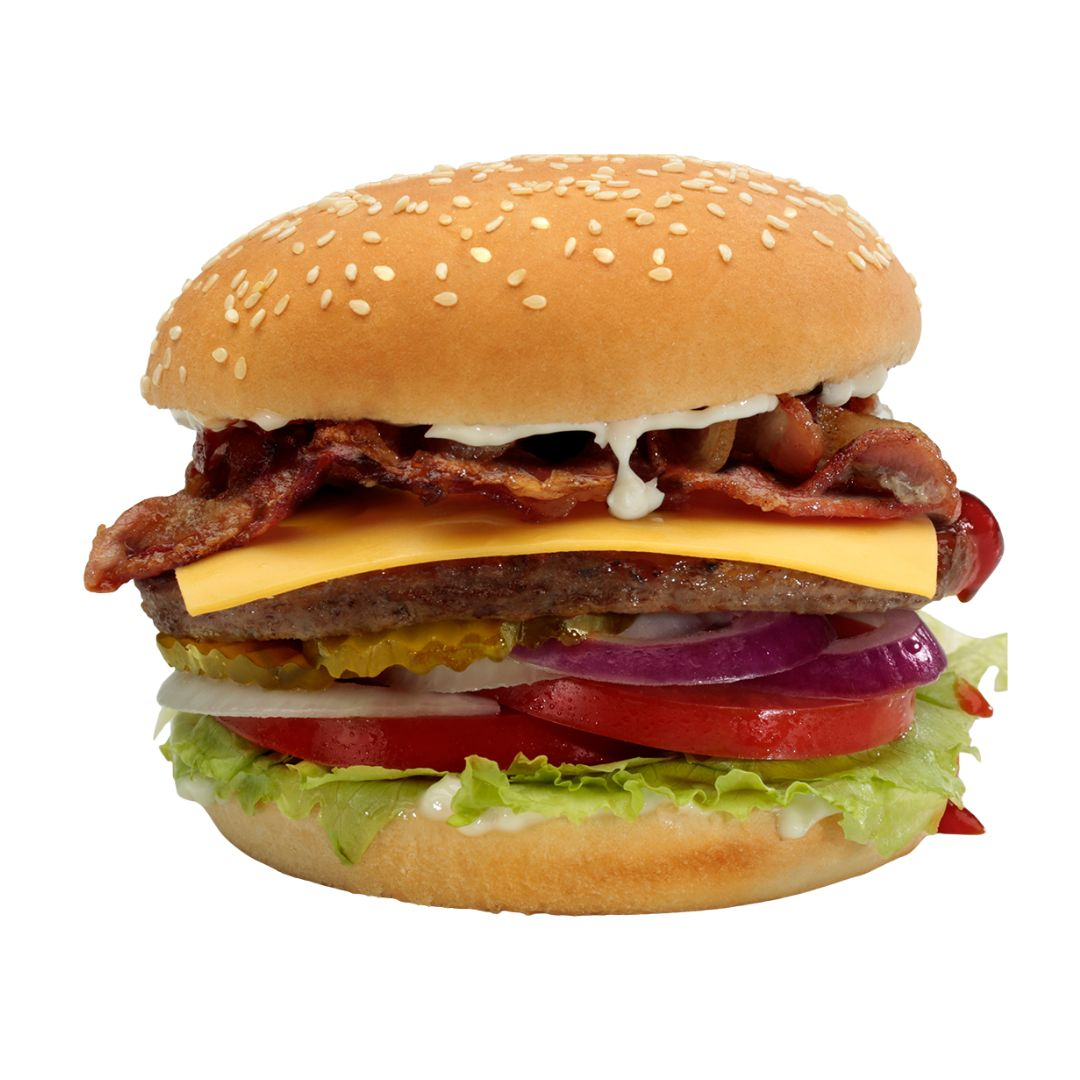Jugosa hamburguesa con carne de res, queso amarillo, tocino en trozos, mayonesa, lechuga, tomate, pepinillos, cebolla y cátsup. Acompañada con papas francesas y un refresco de lata a elección.