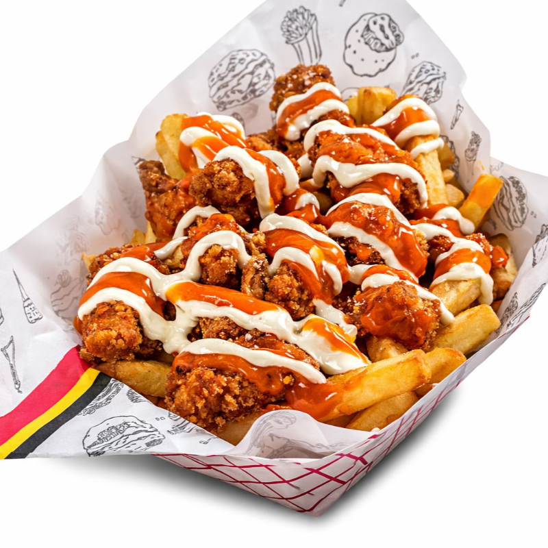 Pappas francesas con pollo empanizado, salseado en aderezo ranch y salsa buffalo.