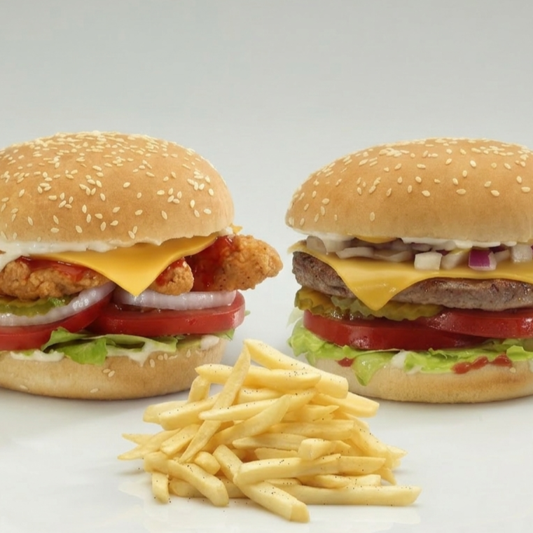 Jugosas Hamburguesas, una con pechuga de pollo empanizadoe y una de carne de res, con queso amarillo, lechuga, tomate, pepinillos, cebolla y mayonesa. Acompañadas con 180 Gr de papas a la Francesa.