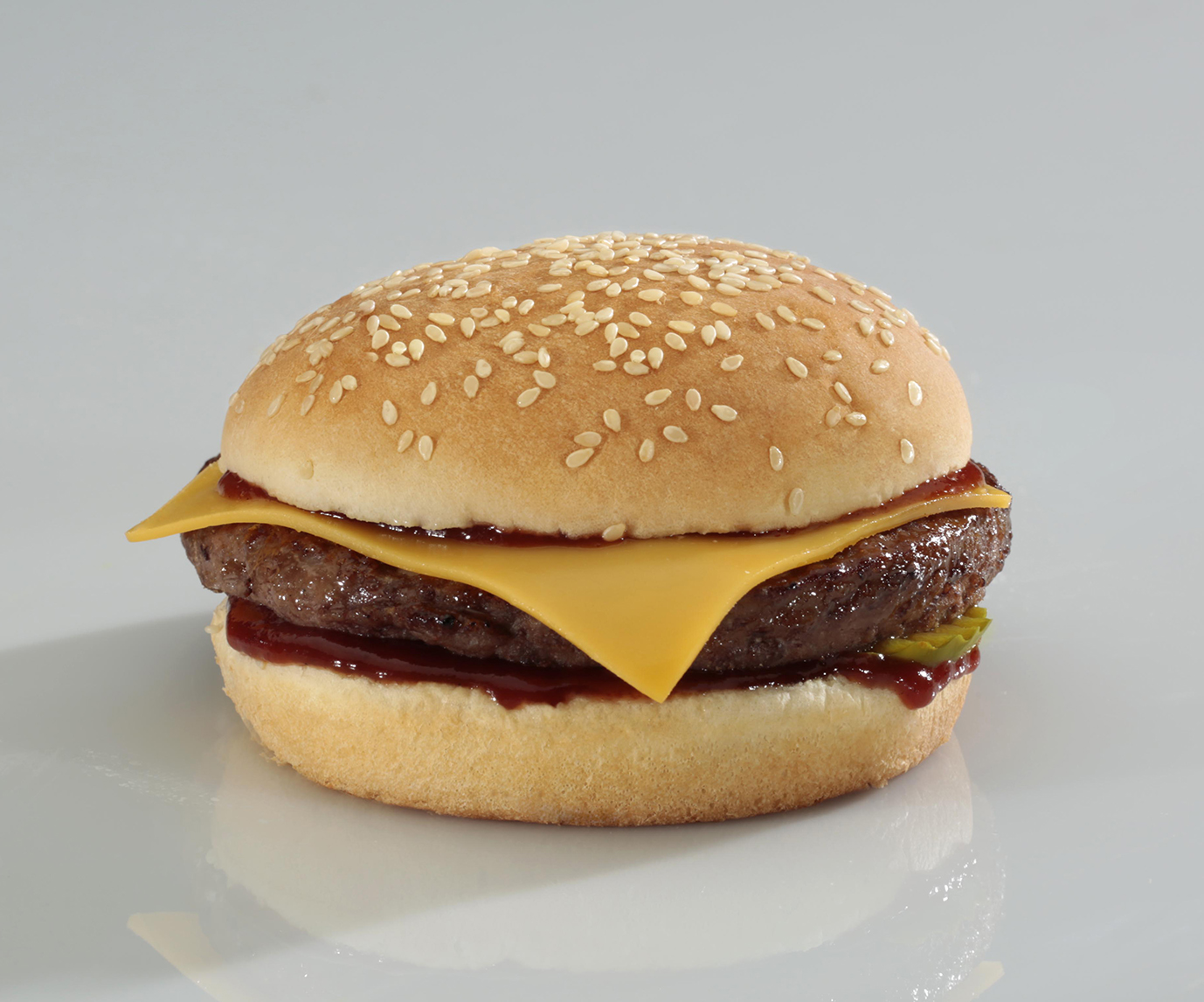 Jugosa Hamburguesa con carne de res, queso amarillo, pepinillos y cátsup. Acompañada con papas francesas y un juguito.