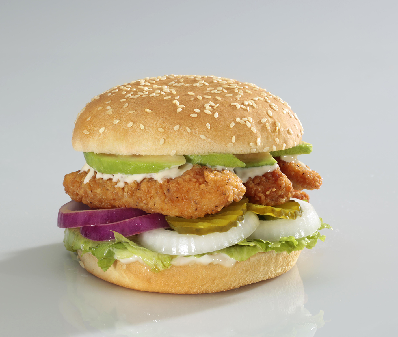 Jugosa Hamburguesa con pechuga de pollo empanizado, guacamole, aderezo ranch, lechuga, pepinillos, cebolla blanca y morada.Acompañada con papas francesas.