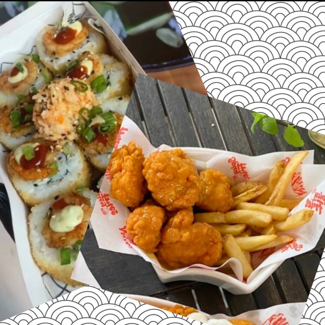 Sushi empanizado , relleno de camron y carne con queso crema y toppi g de crunchiy y chicharron de jalapeño , salseado con macha es delicioso ¡¡¡¡