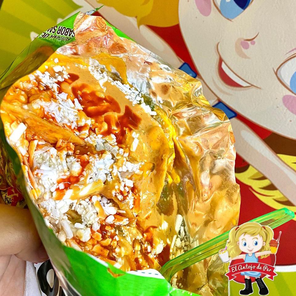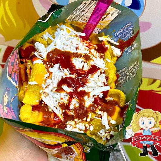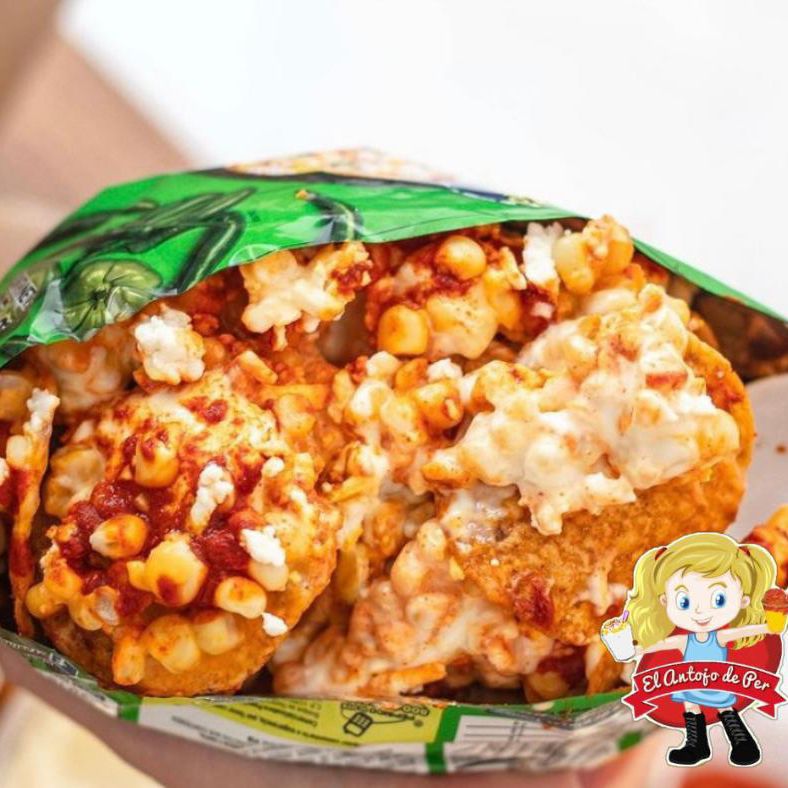 Tostitos 65 g preparados con queso amarillo, elote, crema, chile que no pica, queso blanco rallado.