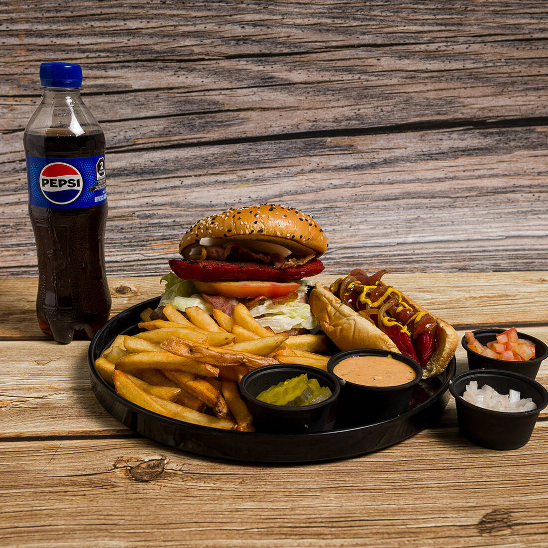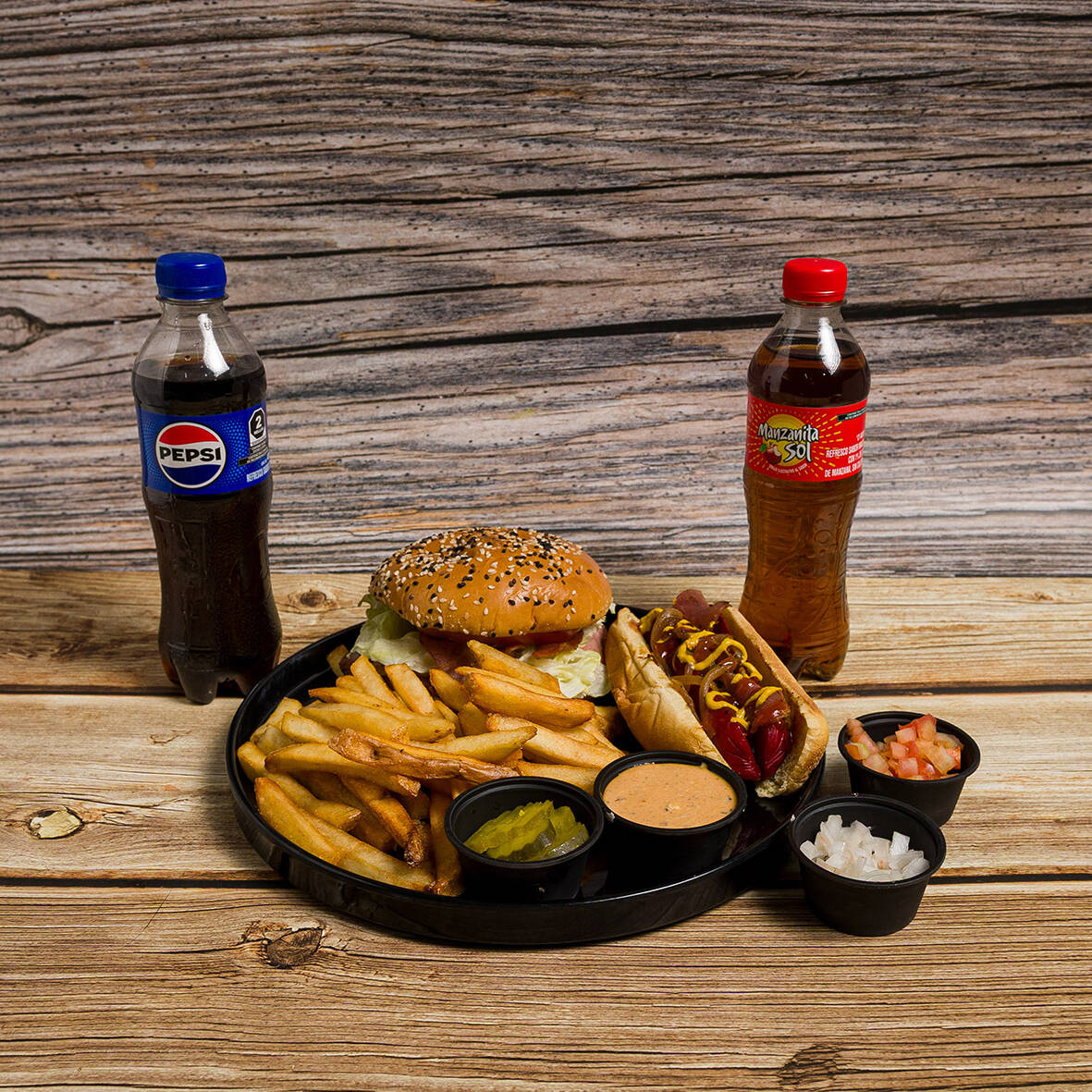 Hamburguesa Luna Roja , Hot Dog Noche Roja , Papas porción y Refresco 400 ml.