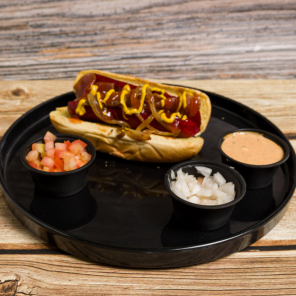 Pan dorado, Salchicha de ASAR y tocino crujiente, con tomate y cebolla.