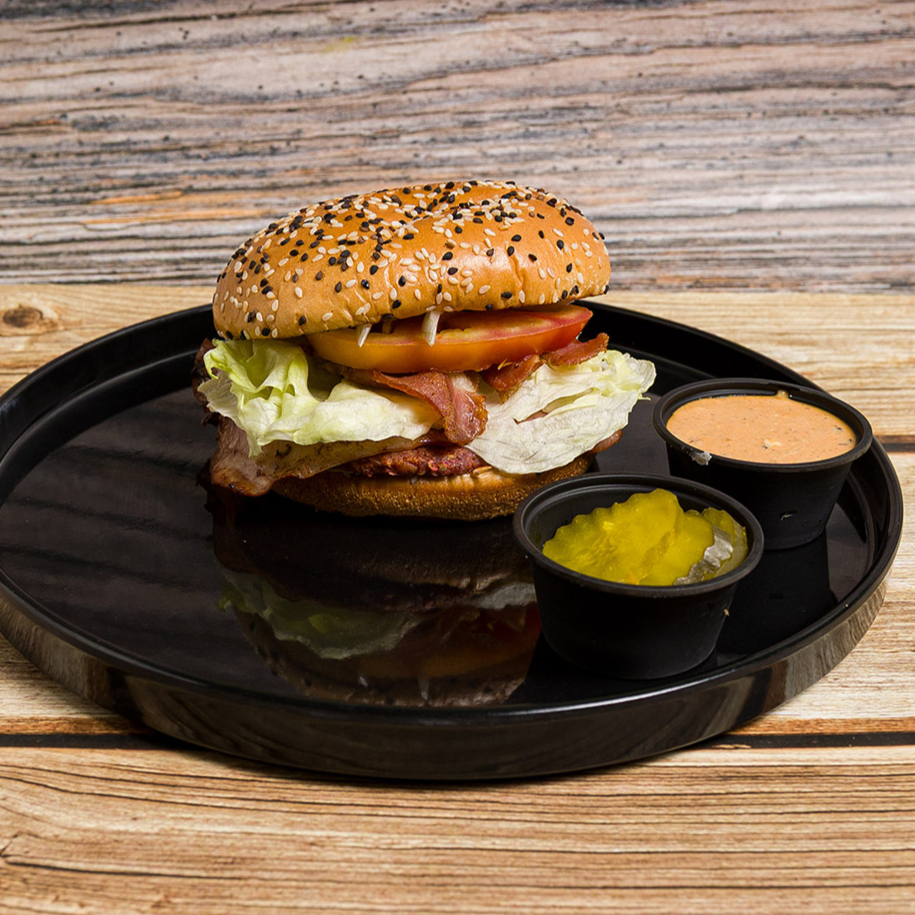 110 de carne, queso amarillo, jamón, lechuga, tomate y cebolla en pan parrillero.