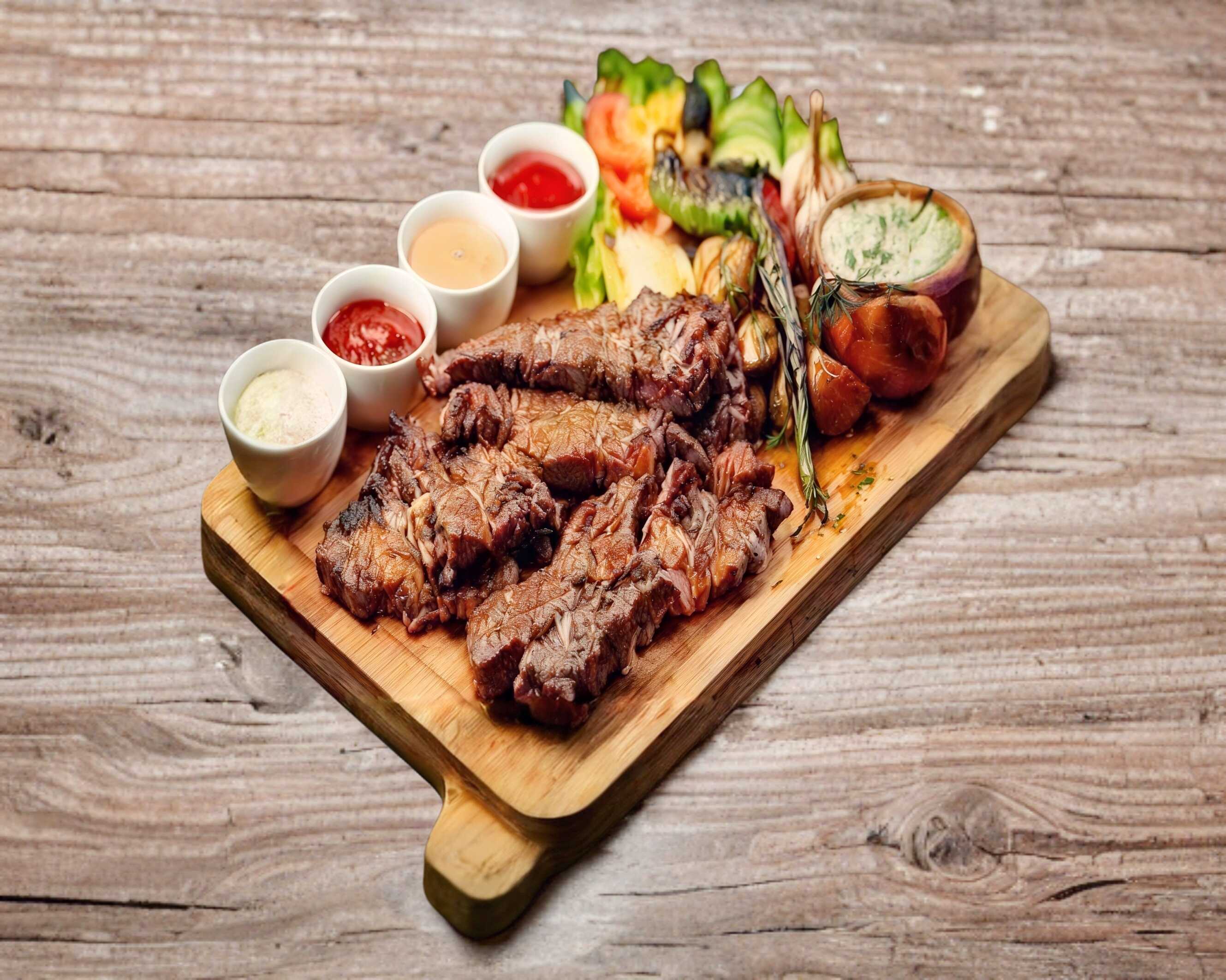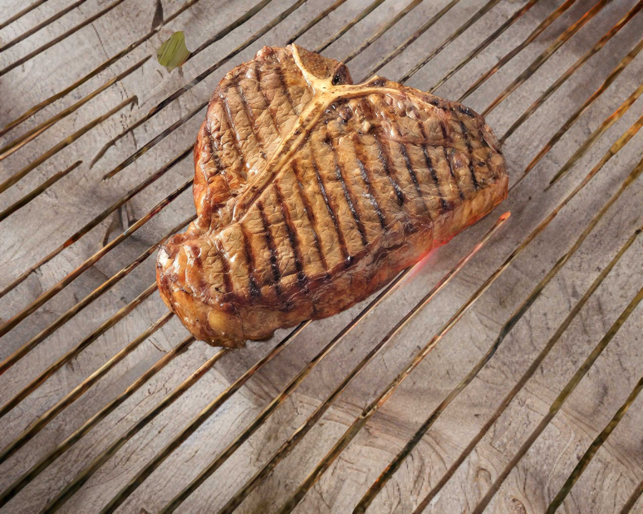 1 pieza de T bone asado al carbon,arroz,frijoles refritos,ensada,1/2 salchicha,cebolla asada, salsa