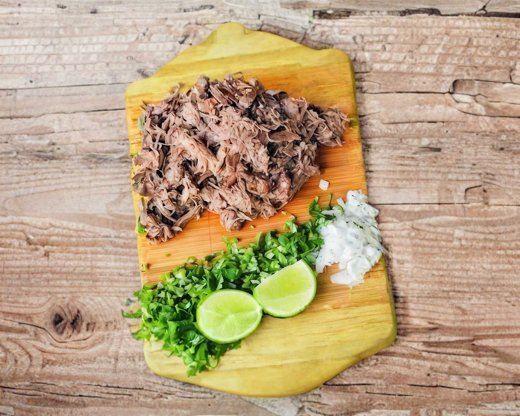 1kg de barbacoa de labio,1/2kg de tortillas cebolla y cilantro picado, limon, salsa