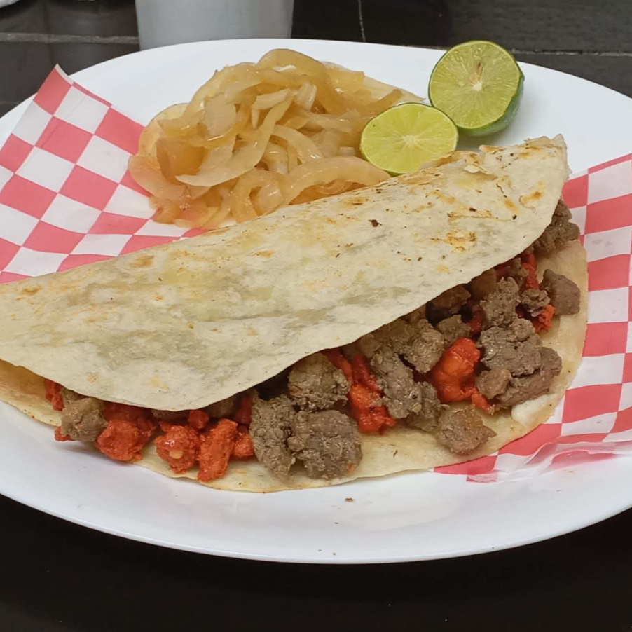 100 GRS DE CARNE AL PASTOR, 100 GRAMOS DE CARNE ASADA, QUESO CHIHUAHUA TORTILLA DE HARINA DE 21 CM