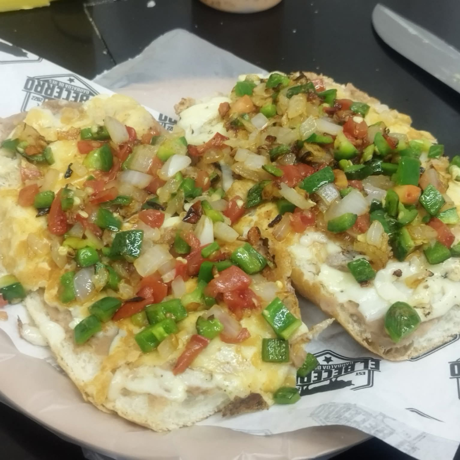 TELERA EN DOS PIEZAS CON UNA CAMA DE FRIJOL CUBIERTA DE QUESO GRATINADO Y MEZCLA ALA MEXICANA