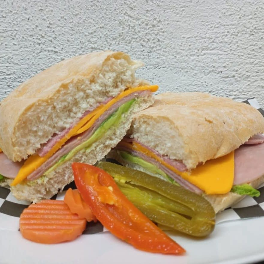 TELERA CON MAYONESA ,CAMA DE AGUACATE , QUESO AMARILLO, JAMON, SALAMI Y CHILES EN VINAGRE